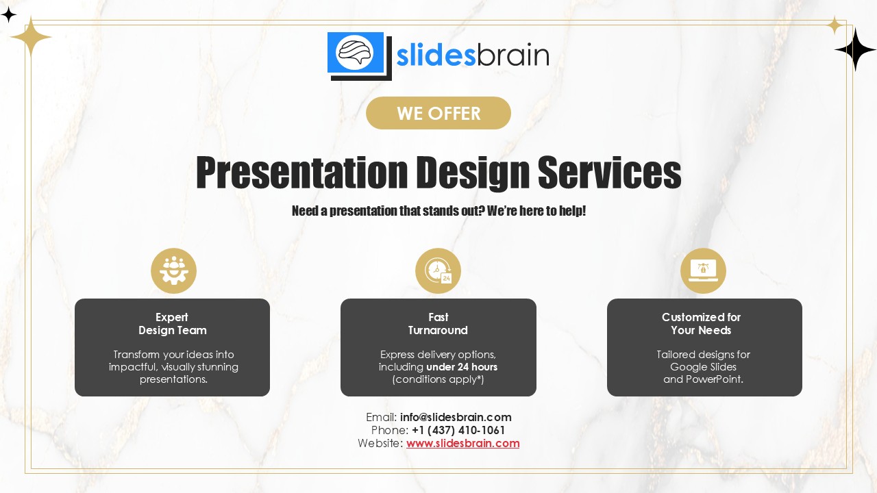 Looking for a slide or PPT that’s uniquely yours? Our presentation design agency is here to help make your ideas a reality. As a leading presentation design company, we focus on delivering premium-grade bespoke presentations that engage your audience and ensure message retention. Kindly get in touch with us for professional custom presentation design services and transform your brand’s message for the purpose that you have in mind.