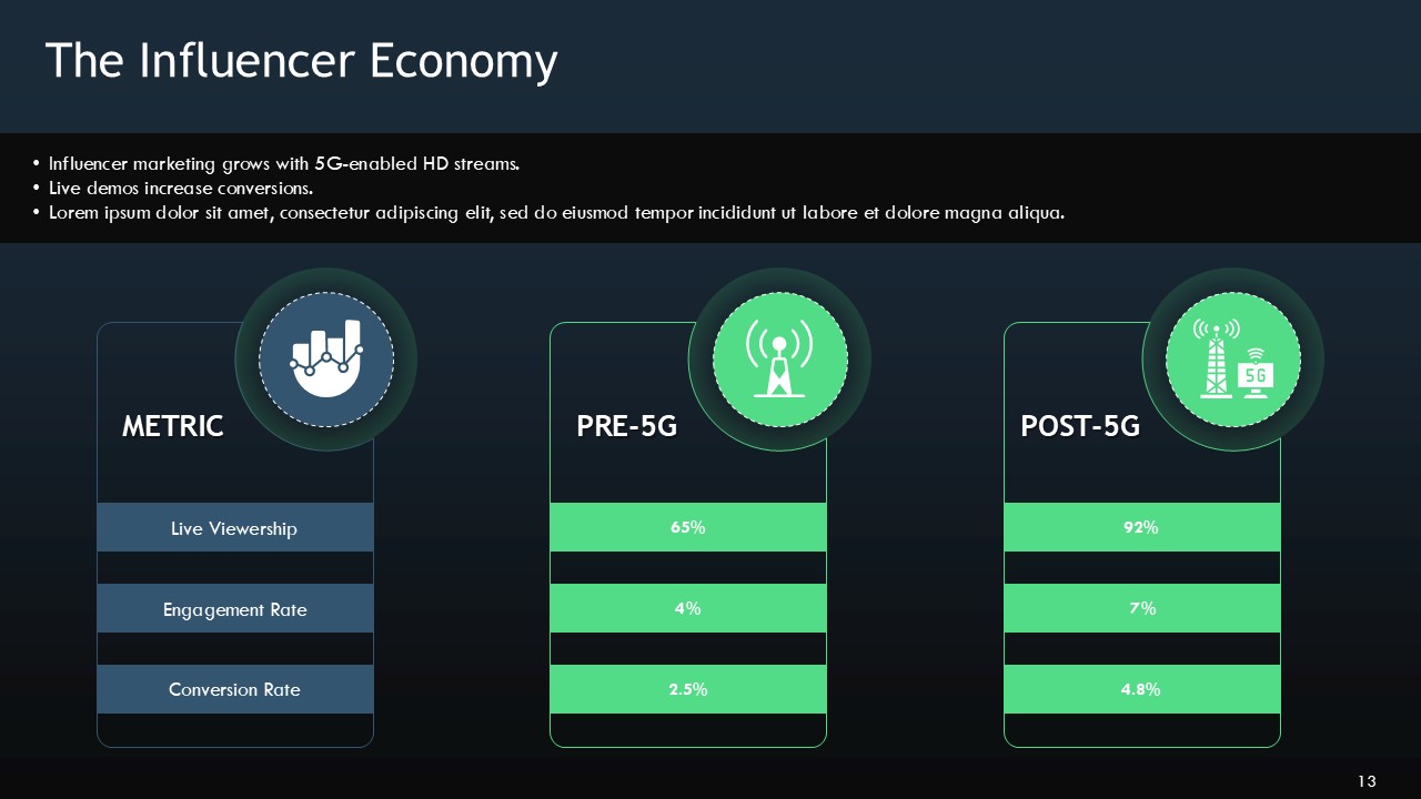 The template even goes as far as to include most of the major social and technological concerns such as the hyper-connected social metaverse; privacy and data concerns in 5G inspired viral events and hyper-connected networks, influencer marketing and the impact of streaming in 8K, and the instant virality of social media. You are equipped with the 5G Wireless Technology In Social Media Presentation Template to present social impact, culture, and commerce alongside technologies themselves.