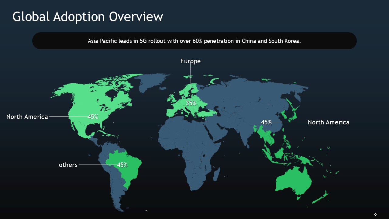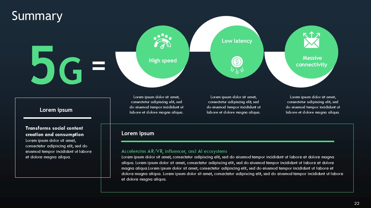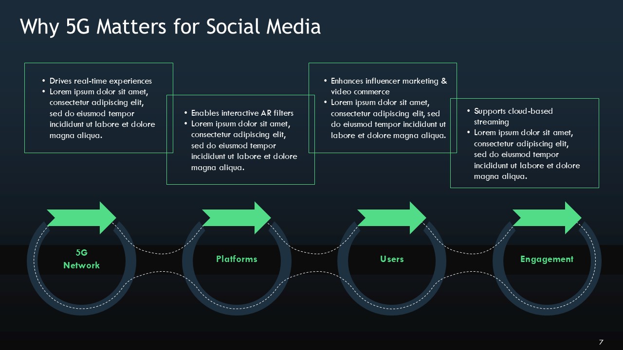 The mixture of black and green are strategically selected to create a monochromatic palette and are very specific with their meanings: black elements represent the massive data foundations and infinite expanse of the digital world, while bright green elements represent active signals and are even animated to show levels, growth, and user engagements. The monochromatic palette of the 5G Wireless Technology In Social Media Presentation Template drives a high level of communication on even the most intricate topics such as network slicing to determine app priority, or edge computing to acquire faster feeds.