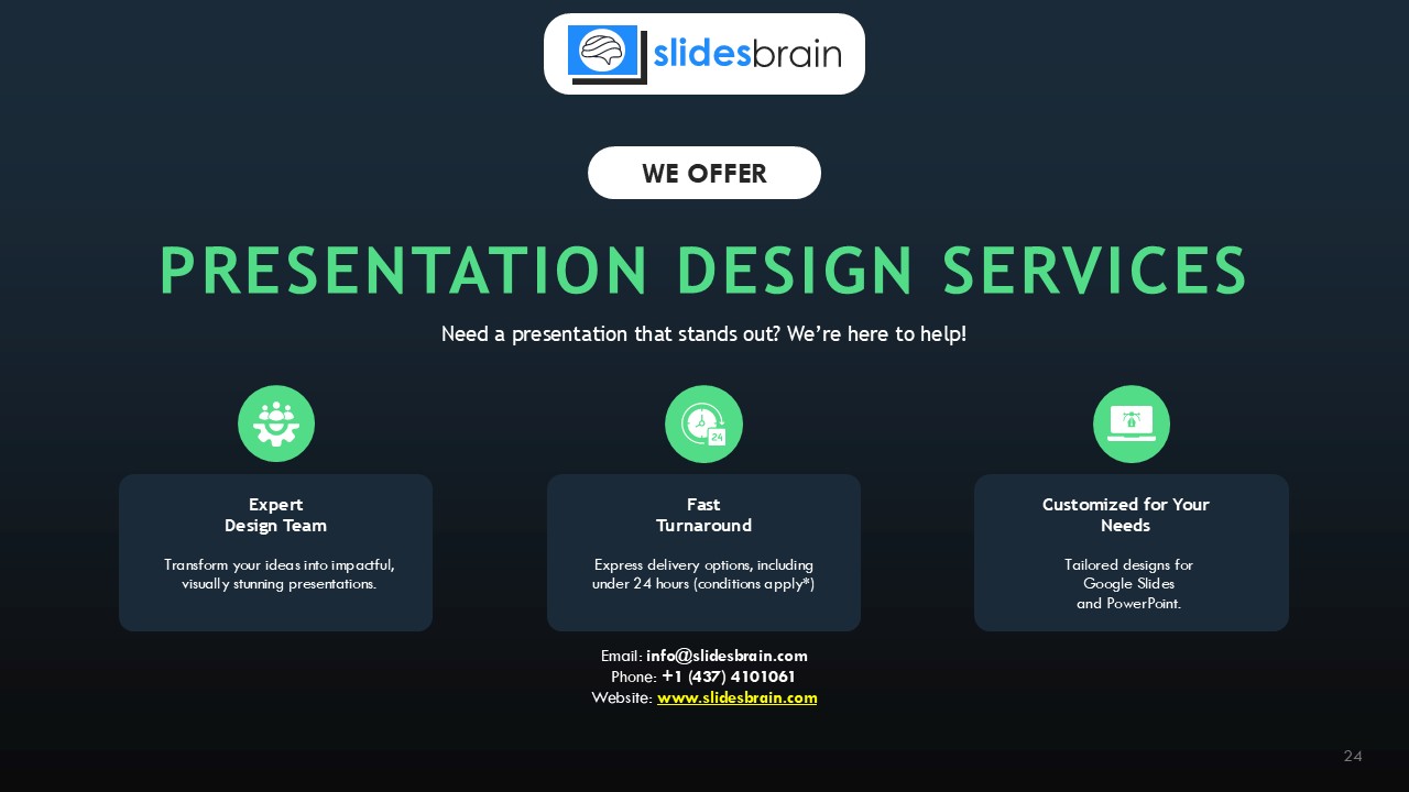 Looking for a slide or PPT that’s uniquely yours? Our presentation design agency is here to help make your ideas a reality. As a leading presentation design company, we focus on delivering premium-grade bespoke presentations that engage your audience and ensure message retention. Kindly get in touch with us for professional custom presentation design services and transform your brand’s message for the purpose that you have in mind.