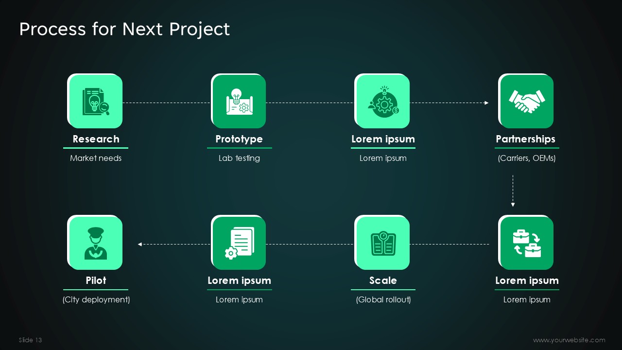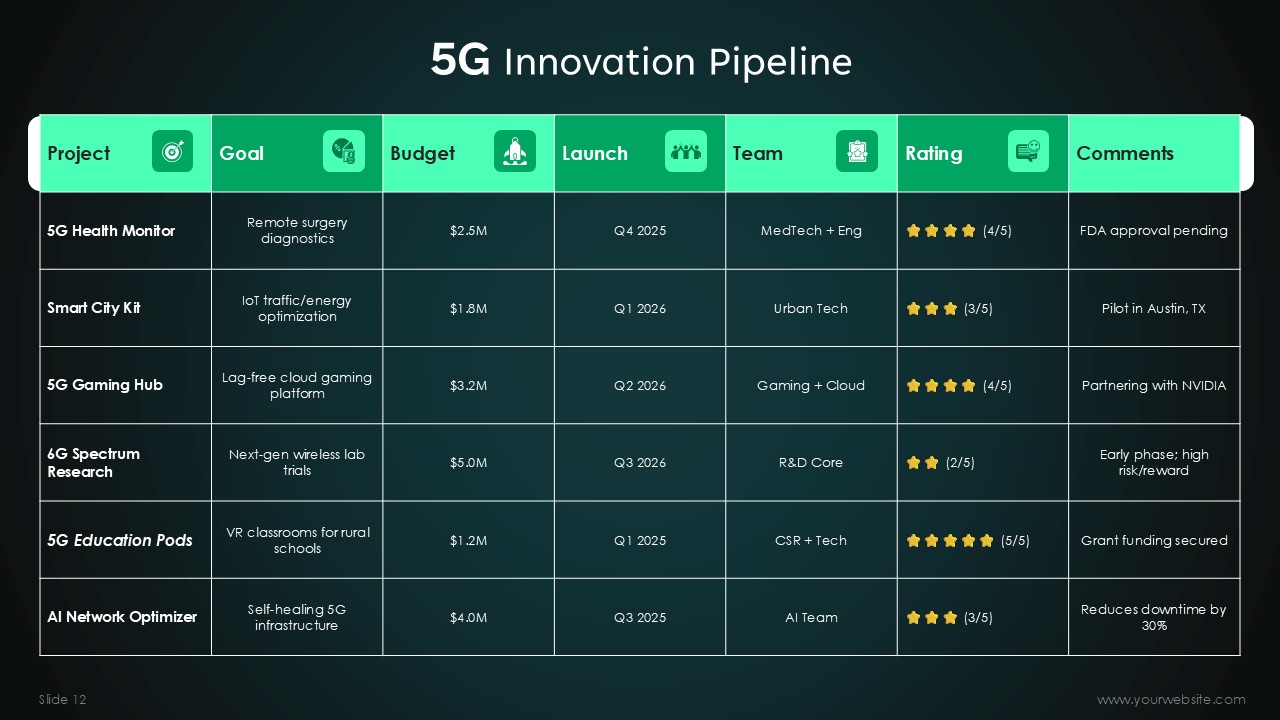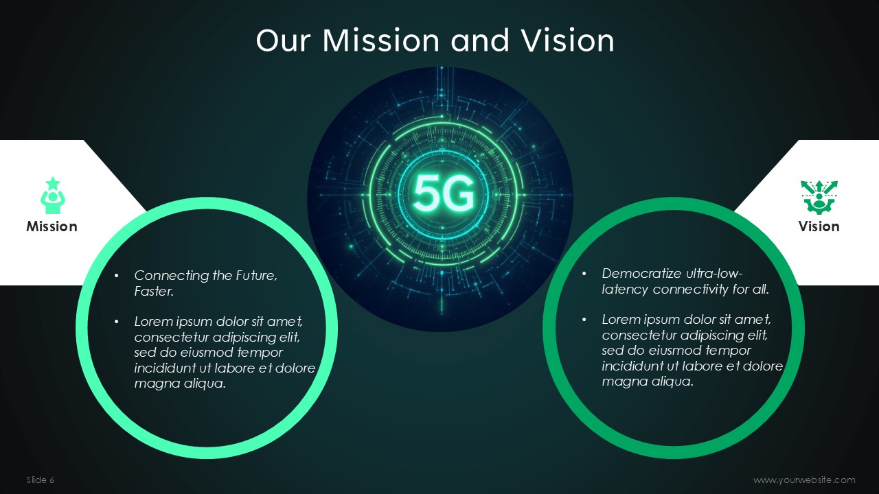 In the 5G Wireless Technology Newsletter PPT Presentation Template the combination of military green and black is both sophisticated and purposeful. The black background is deep and holds a premium sense of technological authority, while the green pulls out and marks important metrics and highlights innovations, milestones, and KPIs. This color strategy serves the template well as an industry-leading communication tool as the information is designed to command attention and be remembered.
