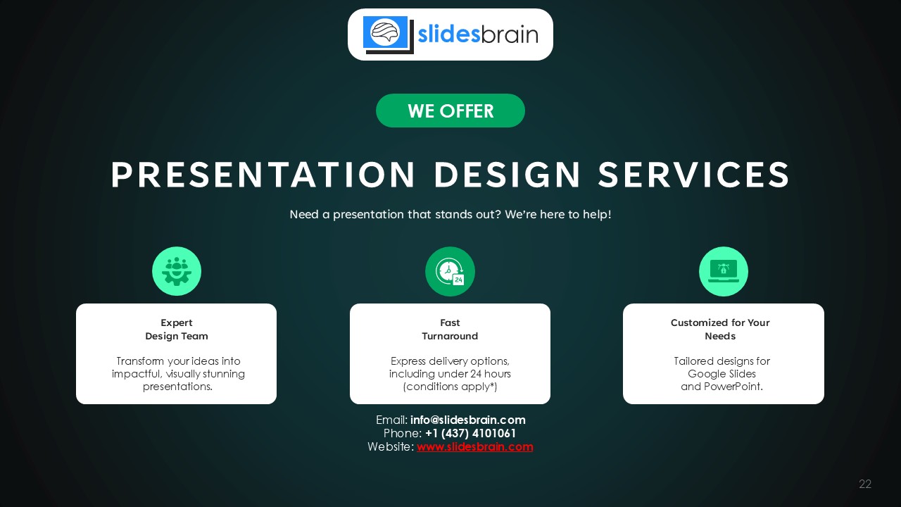 Looking for a slide or PPT that’s uniquely yours? Our presentation design agency is here to help make your ideas a reality. As a leading presentation design company, we focus on delivering premium-grade bespoke presentations that engage your audience and ensure message retention. Kindly get in touch with us for professional custom presentation design services and transform your brand’s message for the purpose that you have in mind.