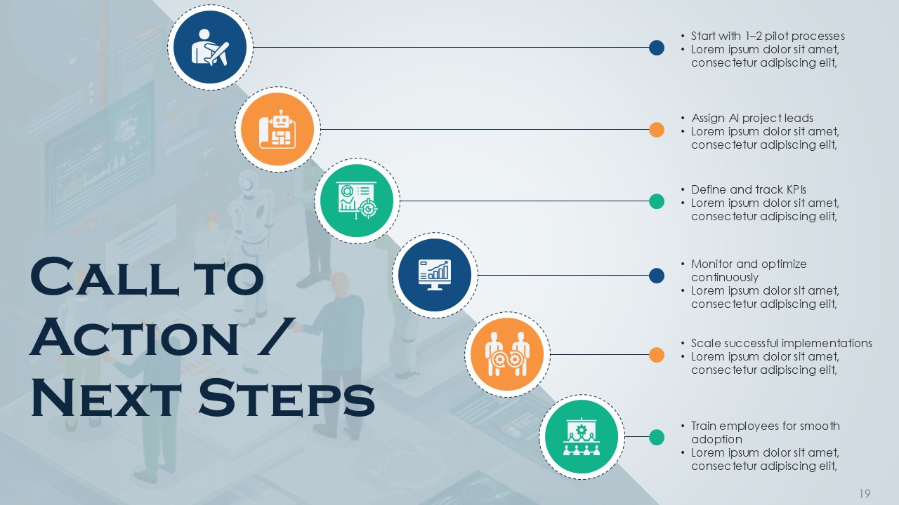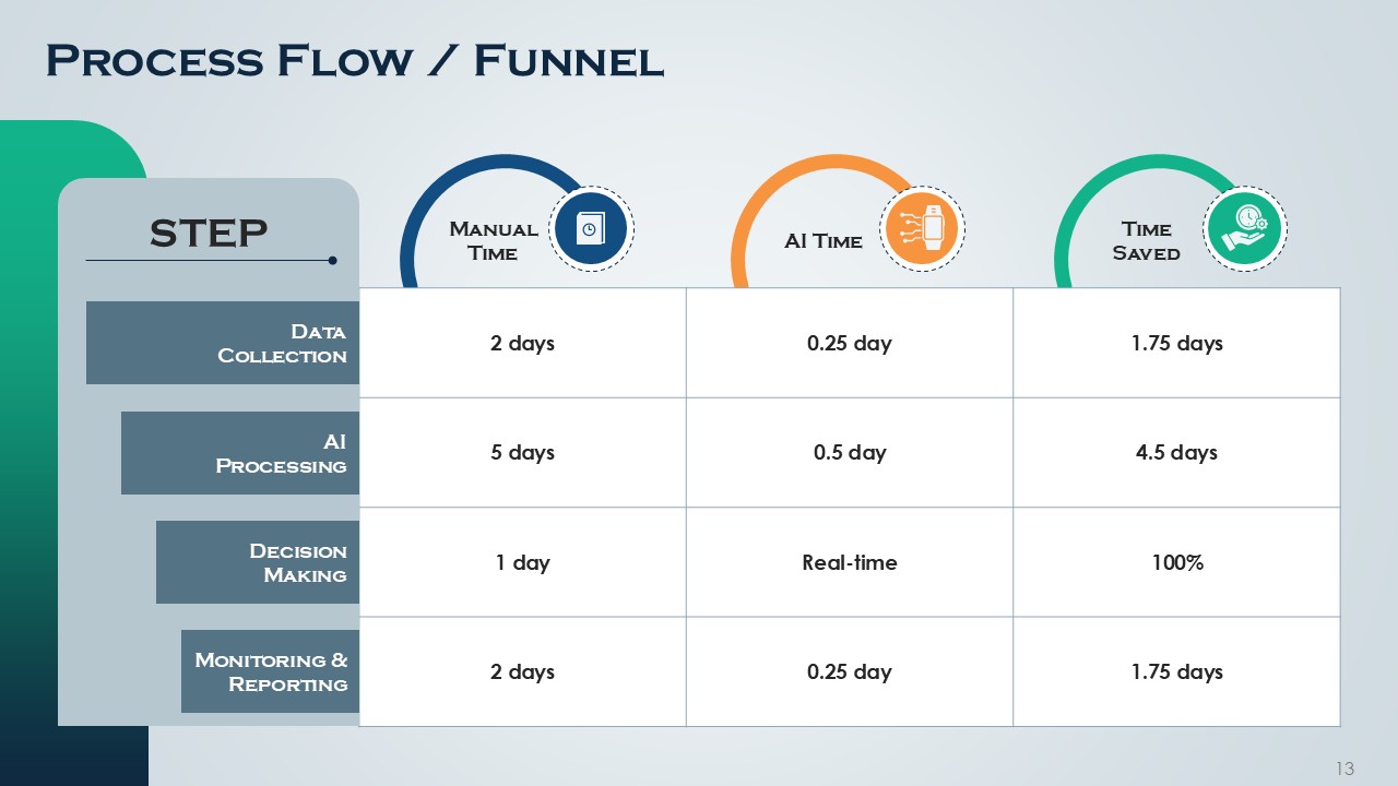 The template is designed to address the audience’s wide range of concerns, including the need for reskilling, change management, the automation of AI within core systems, business value, and the template’s broad scope designed to offer integration within operational workflow enhancement, predictive maintenance, intelligent virtual assistants, and automated decision support analytics.