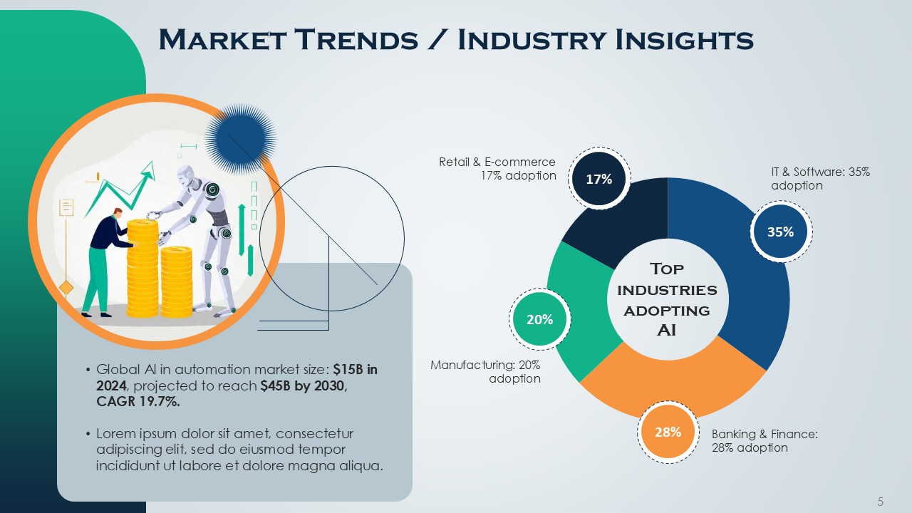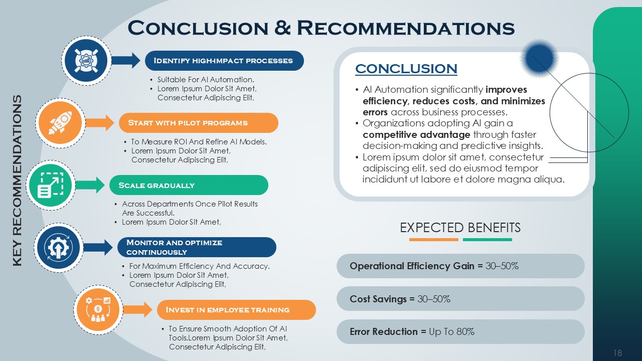 The Automation powered by AI PowerPoint Presentation Template is a premium set of 21 slides which is intended to demonstrate the integration of artificial intelligence and business process human interactivity. With a combined color scheme consisting of analytical grey, trustworthy blue, growth green, and innovative orange, this template launches the core thesis by having a geometric cover depicting the handshake of human and AI. This presentation template is created with the intent of technology officers, consultants of transformation, and heads of innovation, to help them explain, with the prepared storyline, that the intelligent automated systems are not, and should not be viewed, as competitors; rather, they should be viewed as partners able to provide assistance, insights, and promote the organization to achieve a higher level of competition.