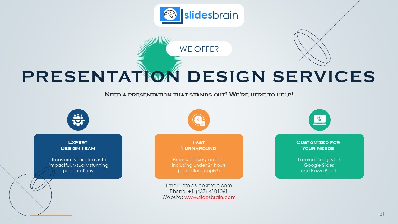 Looking for a slide or PPT that’s uniquely yours? Our presentation design agency is here to help make your ideas a reality. As a leading presentation design company, we focus on delivering premium-grade bespoke presentations that engage your audience and ensure message retention. Kindly get in touch with us for professional custom presentation design services and transform your brand’s message for the purpose that you have in mind.
