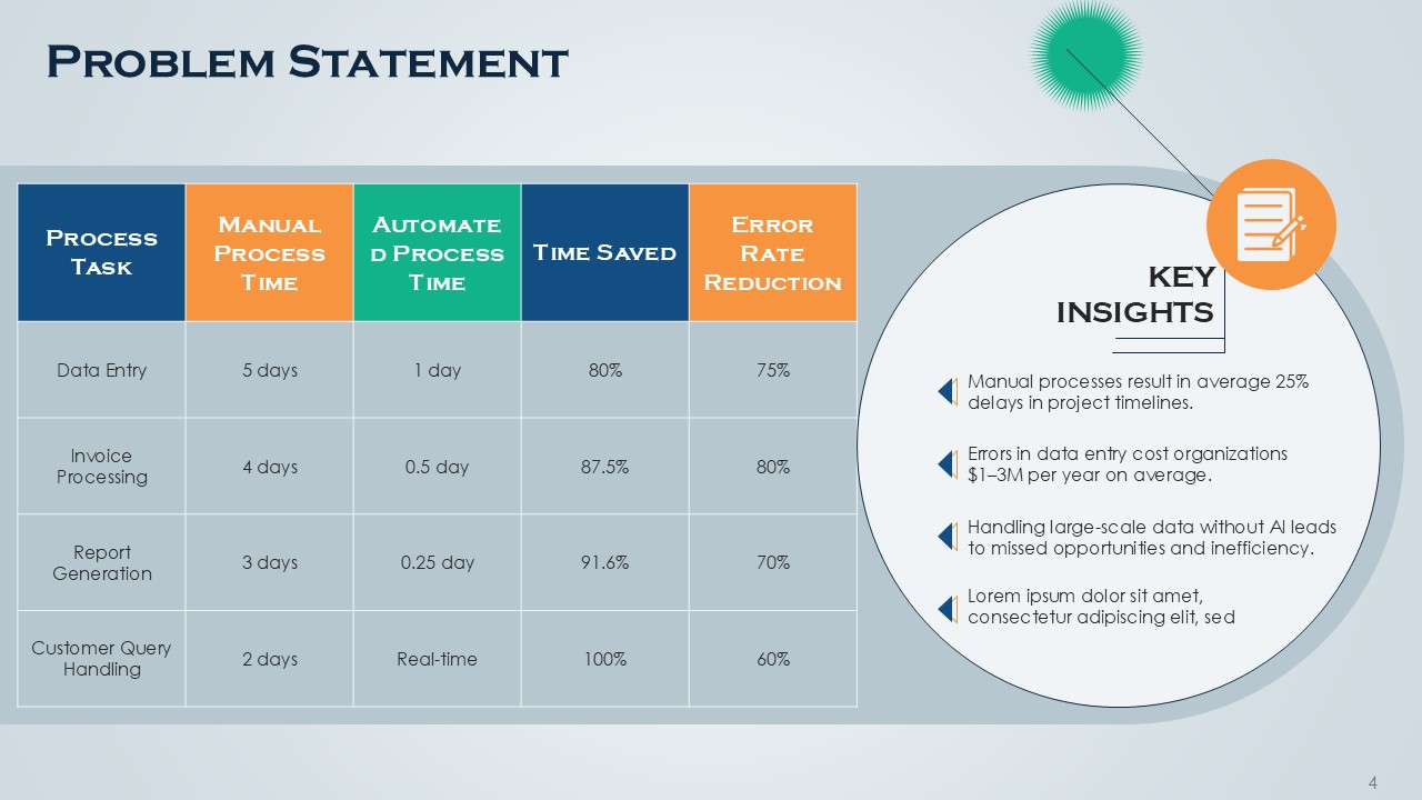 The AI Automation PPT Presentation Template is a premium template fully editable In PowerPoint and Google Slides designed to allow quick and easy customization for targeted industries, technologies, and objectives. With this template, you can help stakeholders shift their perspective on AI, illustrating the potential for collaboration and the rapid progress it can facilitate.