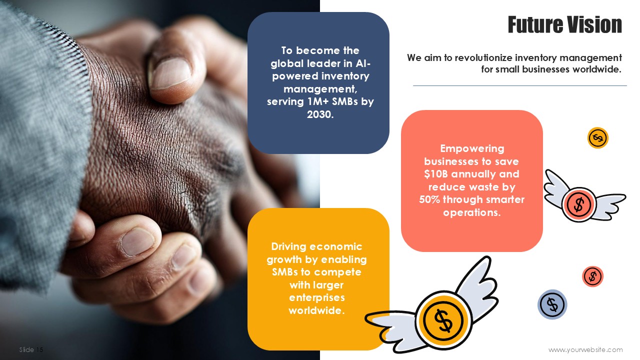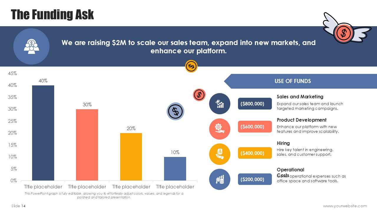 In this PowerPoint presentation, the three colors used—grey, yellow, and red—achieve the desired professionalism, urgency, and optimism in the speech. The grey color serves as the foundation, a neutral and clean tone that assures the presentation is serious and business oriented. The yellow highlights energetic and significant opportunities, milestones, and metrics that need to be emphasized. The red color marks the problems and challenges that need to be addressed the most. It gets the investors’ attention to the areas which need to be fixed the most.
