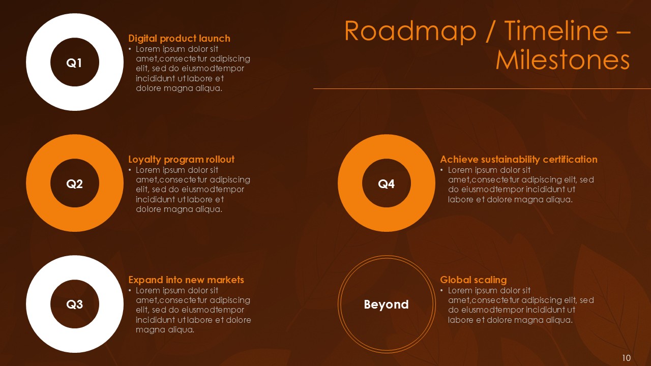 The color orange embodies the energy of autumn, the abundance of the harvest, and the essence of strategic movement, while brown captures the feeling of steadfastness and the rooting necessary to build reliable foundations. Modify this premium template in PowerPoint or Google Slides to suit your organization’s Unique Position & Goals. Enter your performance data into analytical dashboards and performance data into analytical dashboards. Change the color of initiative trackers to align with the priority assigned. Insert your market research into the seasonal trend visualizations.