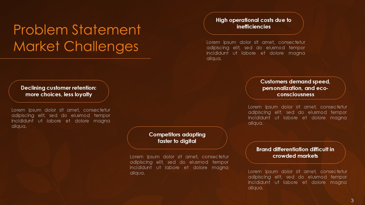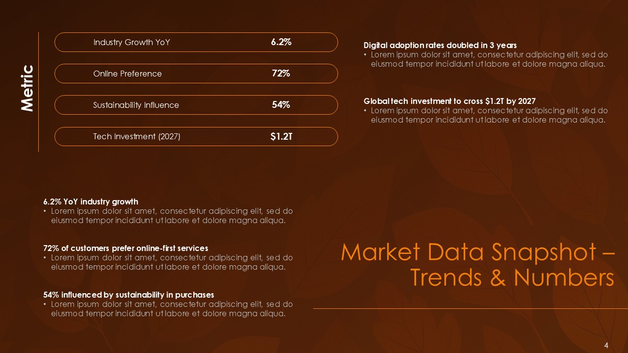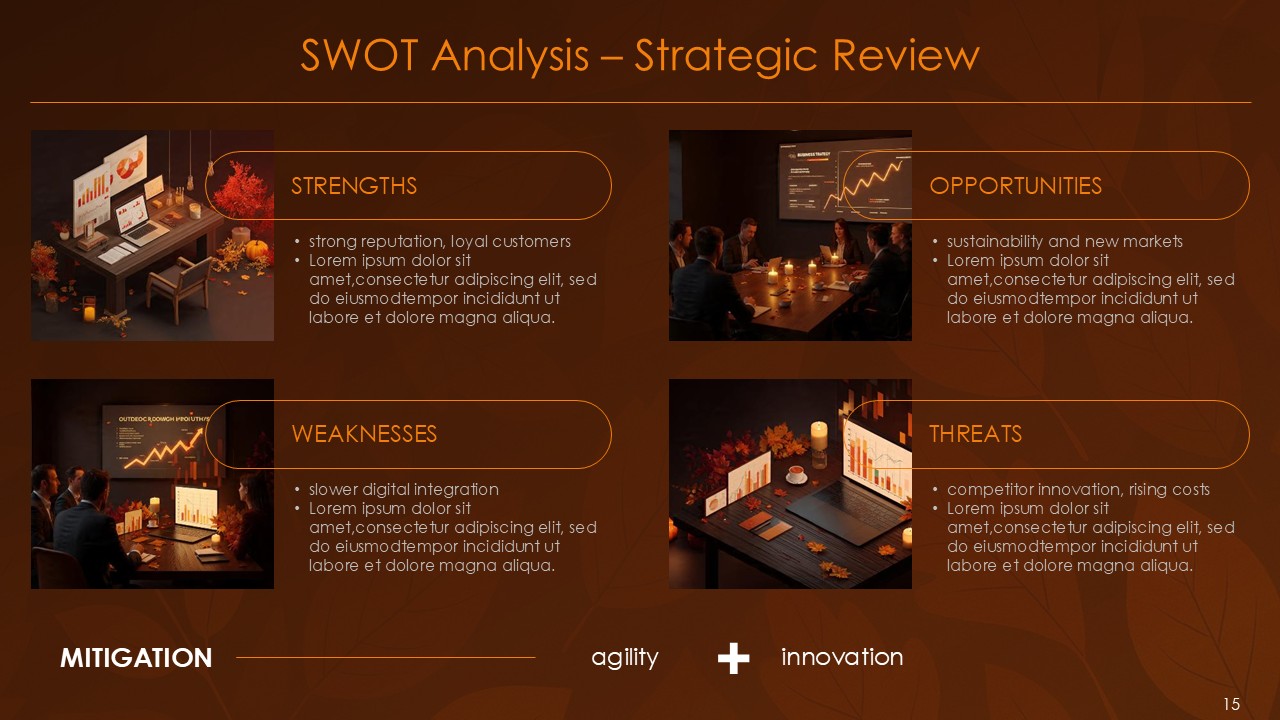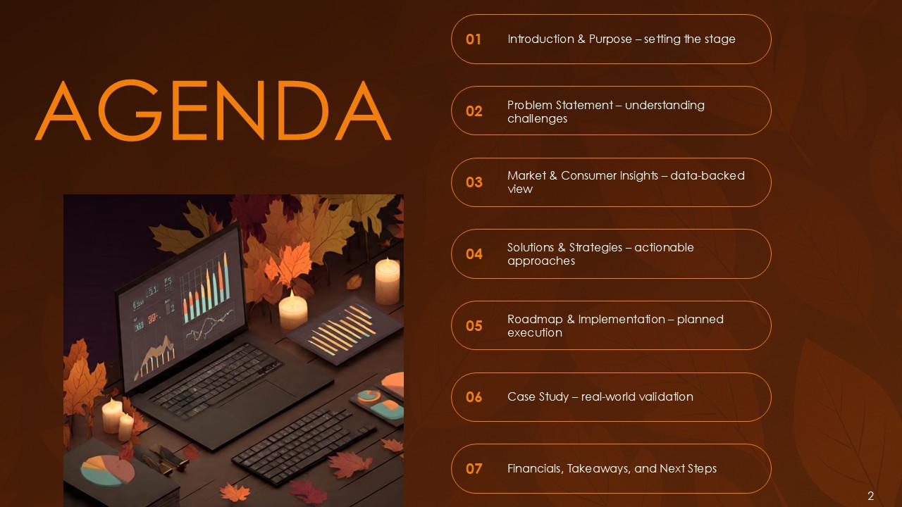 This Autumn Business Insights: Strategies for Growth and Success PPT encompasses a meticulously developed 22-slide blueprint designed for the conversion of seasonal changes in the market into actionable growth opportunities. With a classy and sophisticated look featuring a palette of harvest orange and earthy brown, this template embodies the thoughtful analysis and strategic creativity that business leaders need for the management of the most pivotal quarter of the year. The Autumn Business Insights: Strategies for Growth and Success PPT articulates your growth story with the right balance of analysis and visual sophistication to assure clarity and confidence, whether addressing Q3 results, determining priorities for Q4, or setting up for the following year.