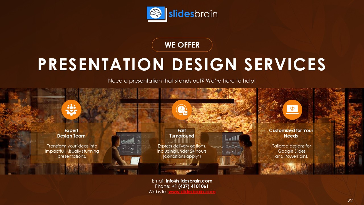 Looking for a slide or PPT that’s uniquely yours? Our presentation design agency is here to help make your ideas a reality. As a leading presentation design company, we focus on delivering premium-grade bespoke presentations that engage your audience and ensure message retention. Kindly get in touch with us for professional custom presentation design services and transform your brand’s message for the purpose that you have in mind.