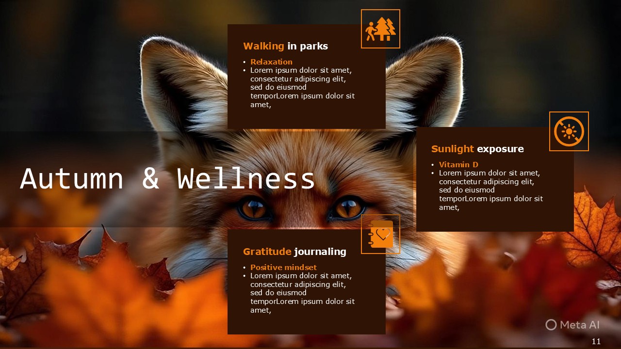 Customize and combine the advanced template and its minimalist design. Replace the image placeholders with your own breathtaking autumn photography, fill in the text boxes, and alter the color accents to suit your branding. The Autumn Cozy Vibes Presentation has many layouts designed for the season, wellness programs, retail campaigns, and team communications. These layouts are easily editable for non-designers.