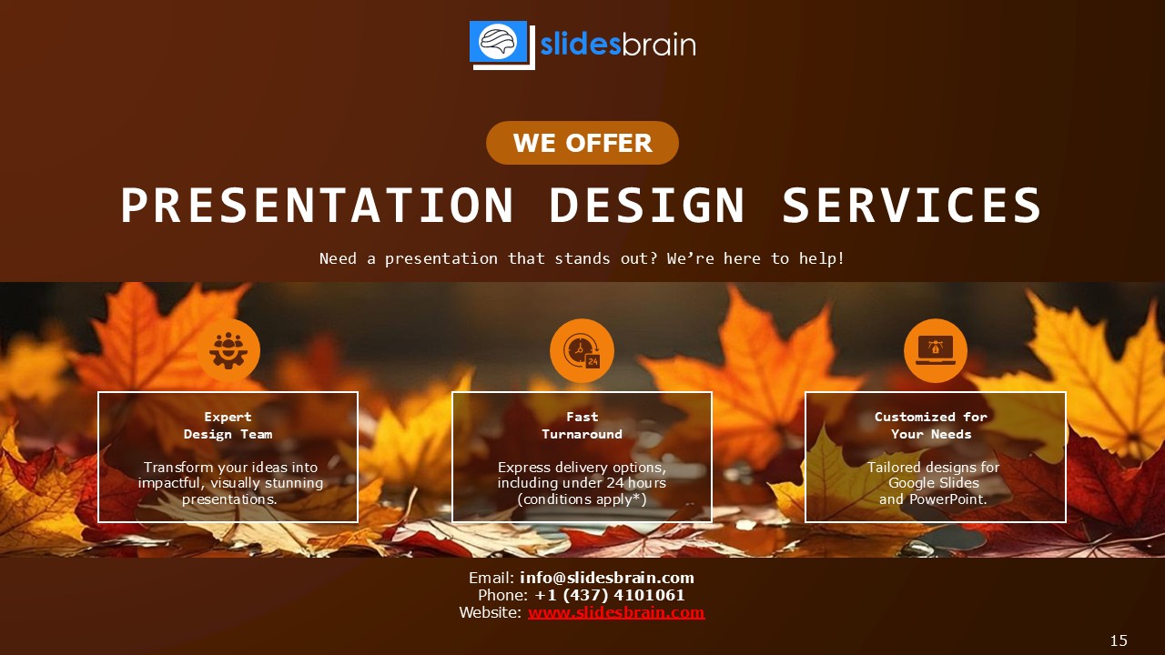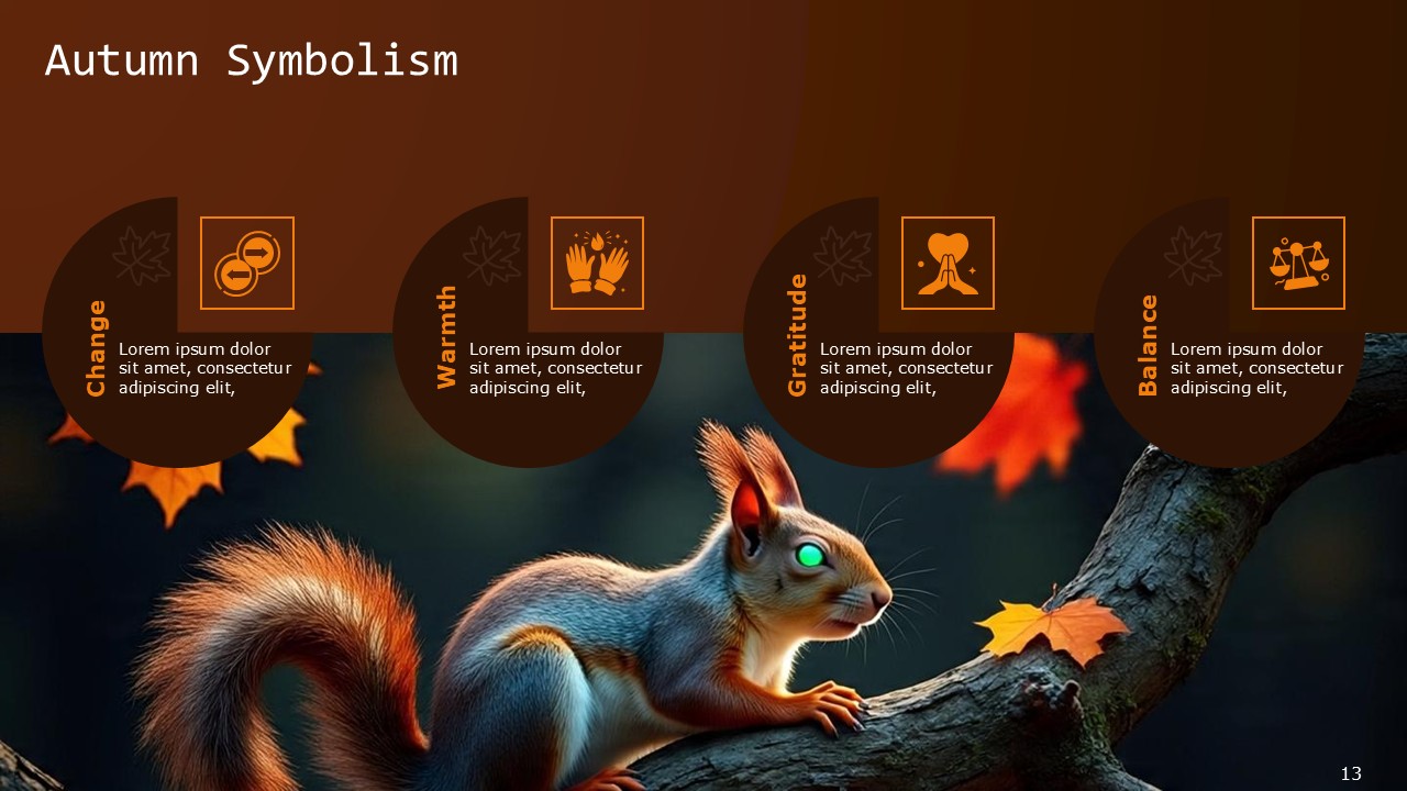 The slides contain minimalist autumn illustrations, whitespace, and professional text layouts done in well-structured typography. These illustrations, layouts, and typography are all compatible with Google Slides and Powerpoint.