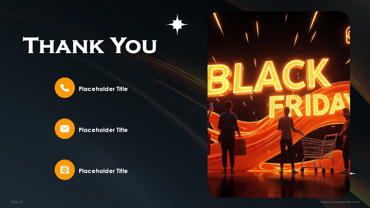 Black signifies sophistication, pricing exclusivity, and premier value while orange suggests urgency, excitement, and the call to immediate action. The two paired together work with psychological symmetry. The black background makes the content on the black promotional items pop. Black Friday Free Google Slides Themes and PowerPoint Template serves this dual purpose and applies the orange and black color dynamic to design presentations that are both premium and compel the viewer to urgency.