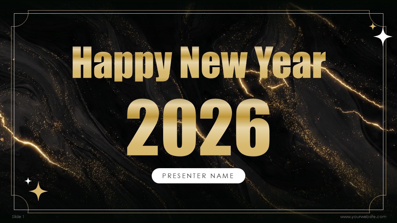 The Black & Gold New Year Party Presentation 2026 PPT pays tribute to class with 18 free slides featuring the expert combination of black marble textures with gold accents to create the ideal luxurious black tie celebratory experience. Also, the deep black, grey, gold, with hints of yellow provide a celebratory essence to the slide, further refining the templates ambiance to premium celebration. The Black & Gold New Year Party Presentation 2026 PPT helps to create the ideal visual base for corporate galas, upscale New Year events, and other celebrations that demand elegance and excitement.