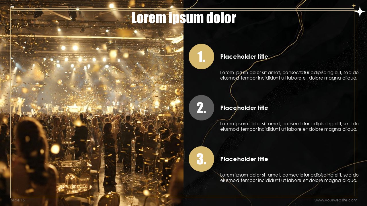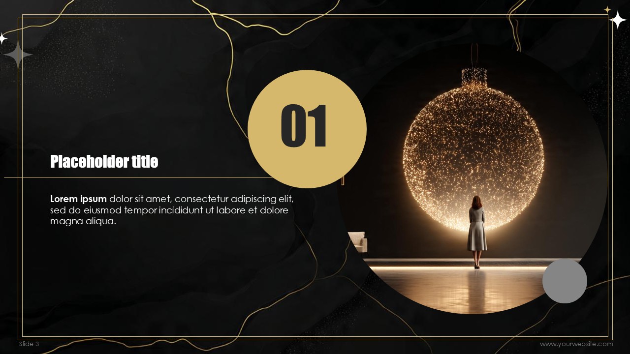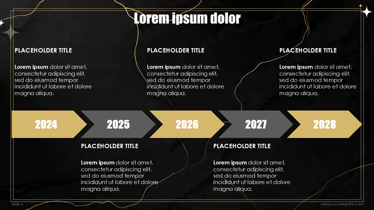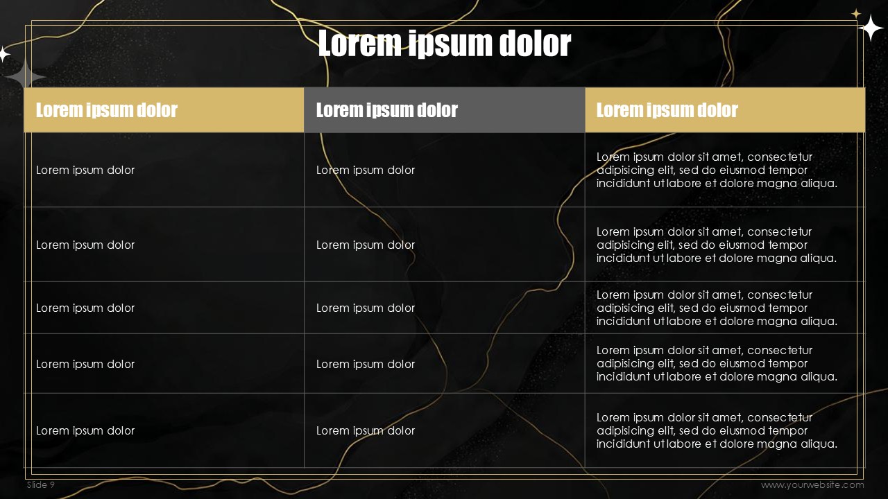 The free templates use subtle and minimalist geometric design patterns and shapes that match the marble and gold textures without overpowering the content of the slides. Every slide has been designed to create a mixture of depth, sophistication, with the black marble textures, and visual interest with gold designs and typography made to celebrate the new years. No other design can ensure that the exclusivity of the events scheduled, special announcements, and other party details remain inclusive to all guests.