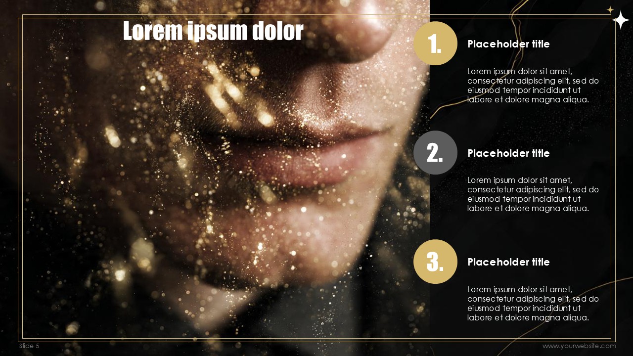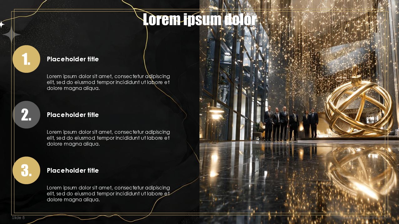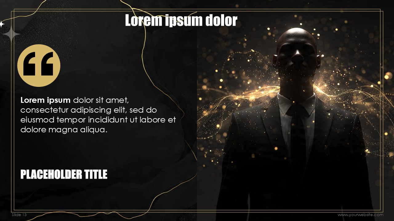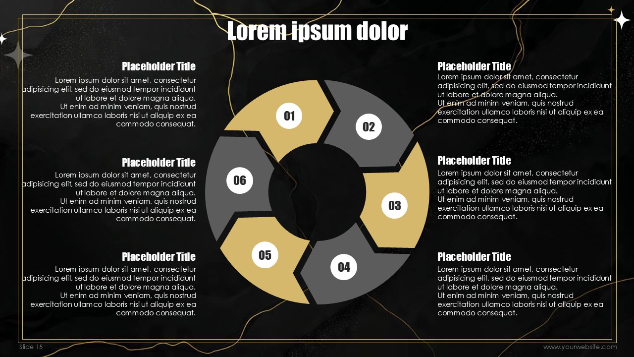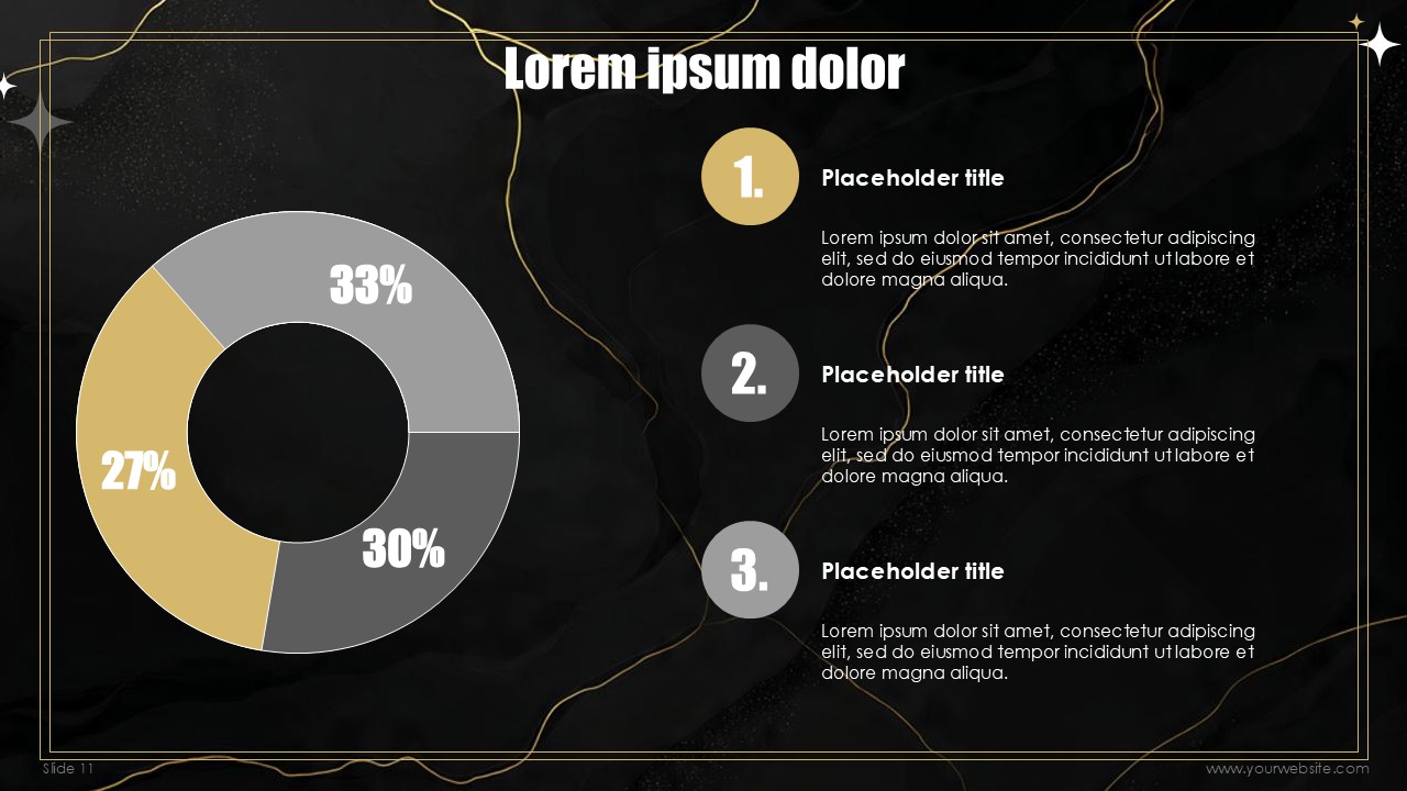 The free templates use subtle and minimalist geometric design patterns and shapes that match the marble and gold textures without overpowering the content of the slides. Every slide has been designed to create a mixture of depth, sophistication, with the black marble textures, and visual interest with gold designs and typography made to celebrate the new years. No other design can ensure that the exclusivity of the events scheduled, special announcements, and other party details remain inclusive to all guests.