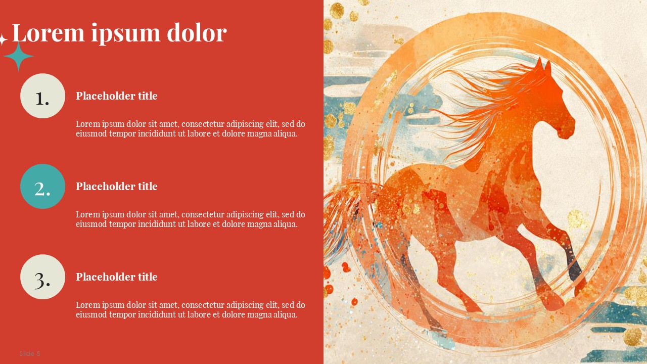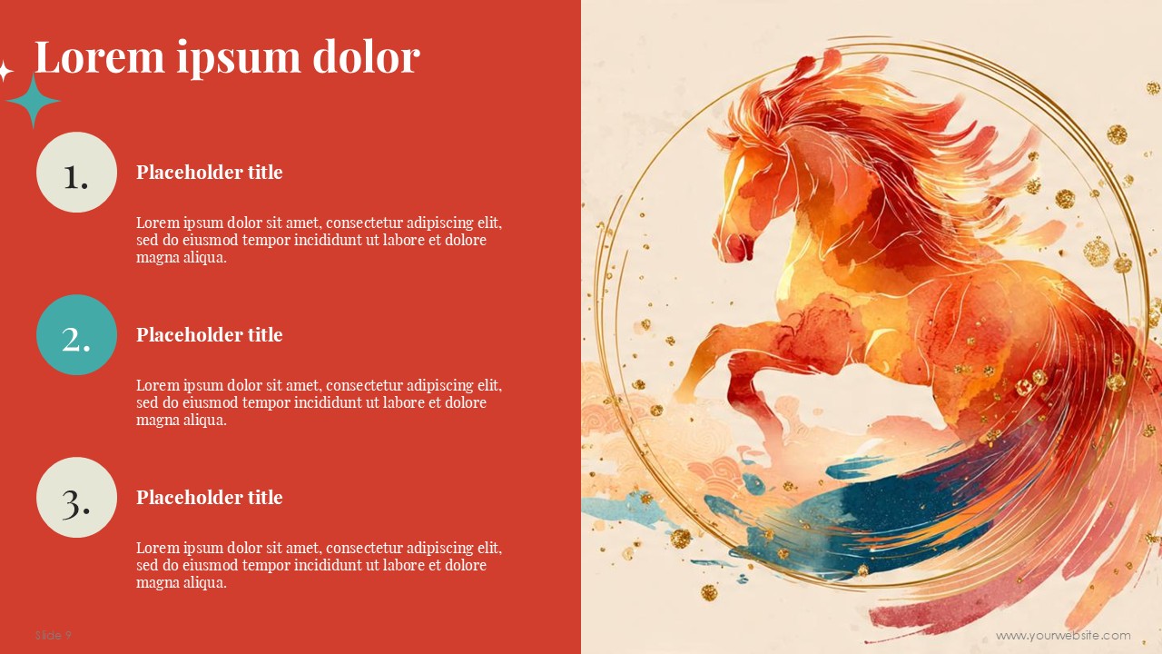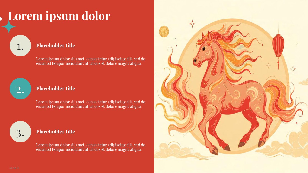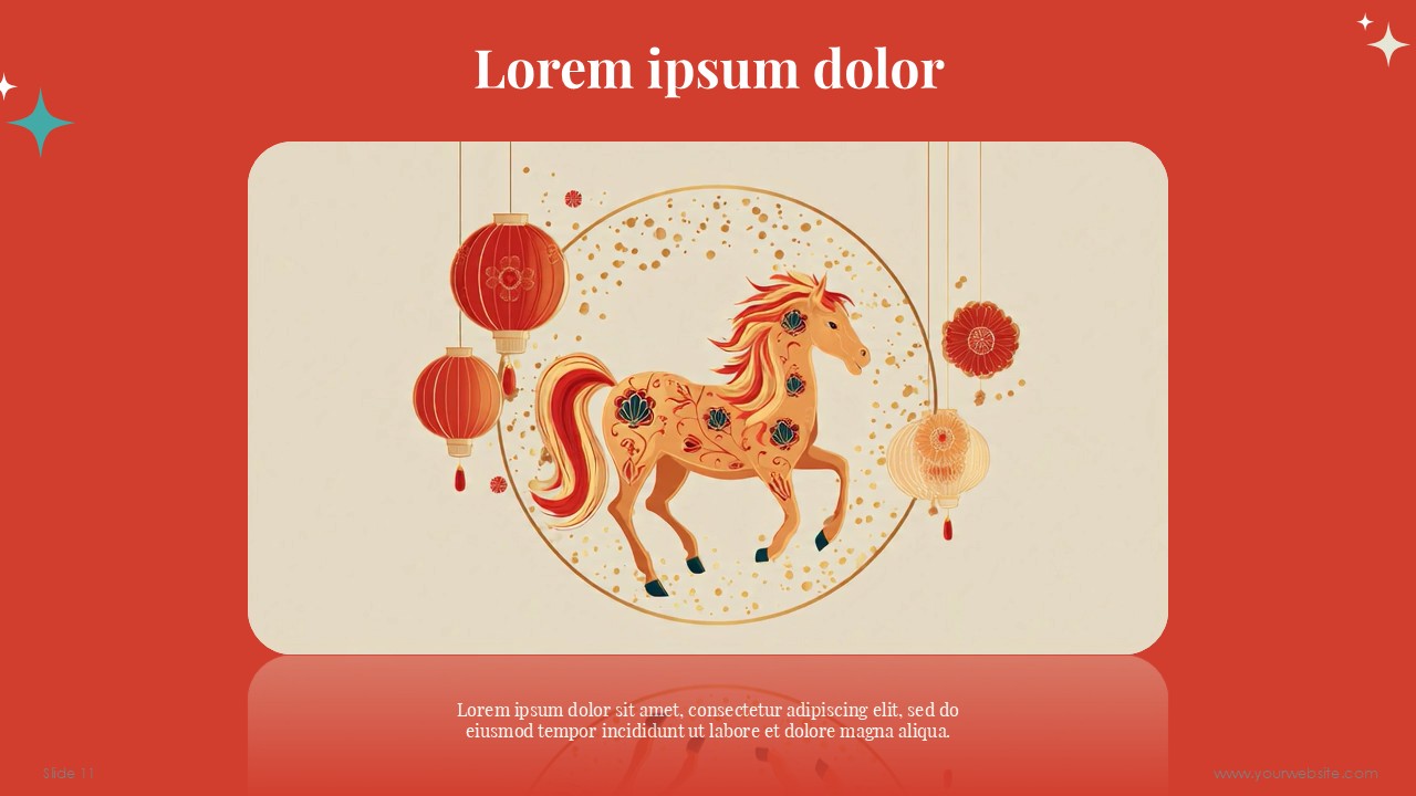 The template has a simple and modern look. The designer has integrated the simple design with the more complex traditional symbolism of the New Year, resulting in a template where every detail has been thought through. Using the light cream background for contrast, each of the slides keeps the text and information of the reader easy to read and understand with perfect clarity while the dynamic colors of the template hint and and speak to all the joy and festivity of the placemet. The template keeps in mind that you have the freedom to choose the text and information, whether it be a simple message of encouragement, a calendar with events planned, or a message with cultural depth to it, and dressed it all in a perfect balance of being easy to use on formal occasions or fun events.