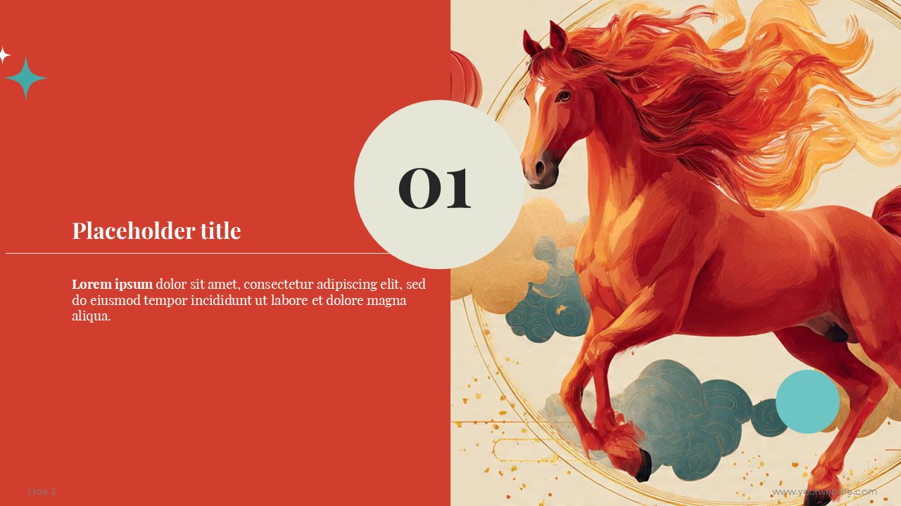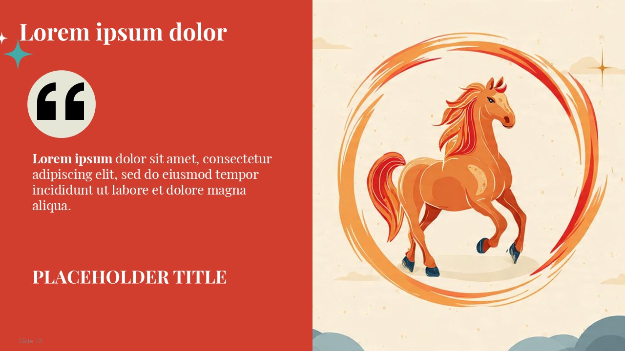 The Chinese New Year Presentation PPT Template includes 18 free slides. Illustrations on the slides express the joy, energy, and positive flow associated with the Year of the Fire Horse. The background illustration of the fire horse is a bursting red, creating a striking contrast with the cream-coloured background. The combination of auspicious red, cyan, and cream gives the template a refreshing and uplifting appearance. The Chinese New Year 2023 Presentation PPT Template is perfect for schools, companies, and community organizations as it provides a framework for hosting events, explaining the traditions, and offering greetings in a cultured and elegant manner.