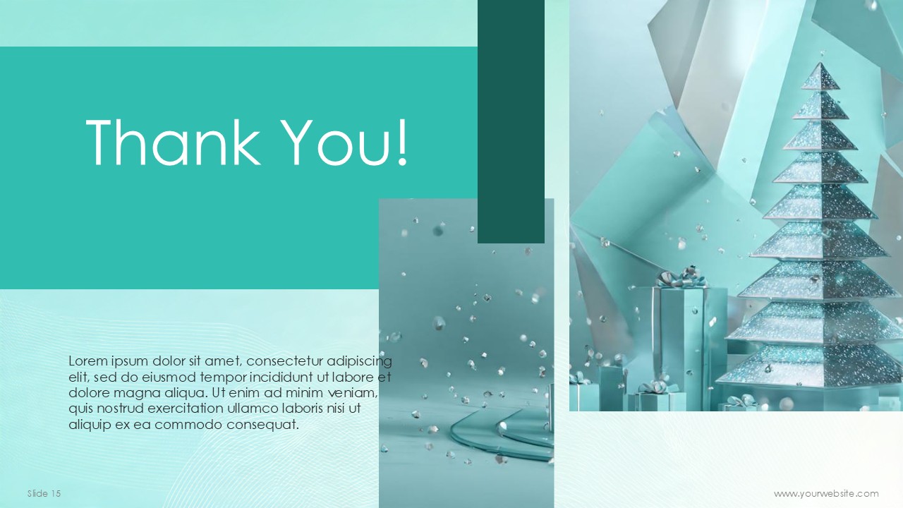 Christmas Corporate Holiday Ornaments Presentation Slides all offer 16 free slides that modernize traditional holiday themes. With a color palette comprising cyan and silver, the template includes an abstract Christmas tree, lightly cyan in the background, along with silver-wrapped presents. The Christmas Corporate Holiday Ornaments Presentation Slides presents the perfect combination of holiday cheer and corporate professionalism. These slides fit perfectly in holiday parties, team gatherings, and seasonal business communications that need a touch of class with a sprinkle of cheer.