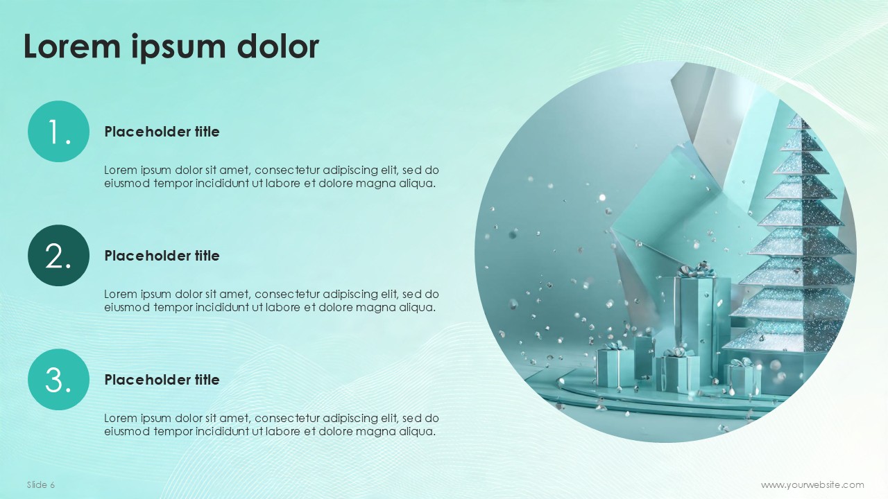 With a clean, modern look, this free template holiday look uses polished elements. Presentation slides in the Christmas Corporate Holiday Ornaments include the decorations cyan and silver set in a tree, arranged in a design that brings content to the forefront. The light background lightens the overall composition while providing atmosphere and ensuring your content is easy to read.The unique color strategy integrates cyan and silver together. Whereas cyan represents modern and fresh clarity and celebration as well as silver representing elegance and corporate sophistication. This color usage throughout the presentation slides on Christmas Corporate Holiday Ornaments gives the presentation a winter-themed visual that is different from a typical Christmas color palette, yet still conveys the warmth and goodwill of the Christmas season. This gives the presentation a very special and professionally credible atmosphere, suitable for everything from holiday messages from executives to celebration announcements from departments.