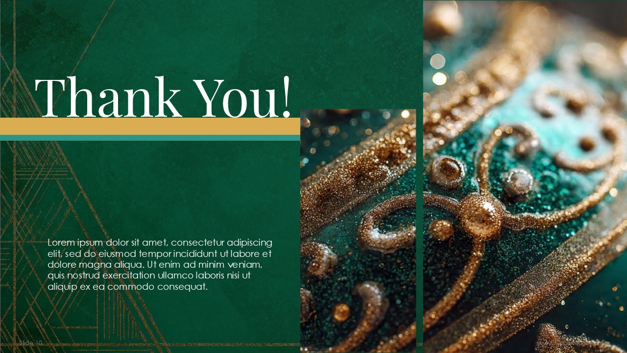 The tactical color palette combines the conventional green representing, growth, cohesion, and the beauty of the natural world; integrated with the rich, achievement-embodying, celebratory gold indicative of high quality and luxury. This intentional chromatic design throughout the Christmas Festive Decoration Corporate PPT Template crafts a congruent narrative aligned with corporate success and goodwill to the recipients of the presentation. This dual suitability is advantageous for temporary internal holiday communication with members of the corporate team and external correspondence with clients.