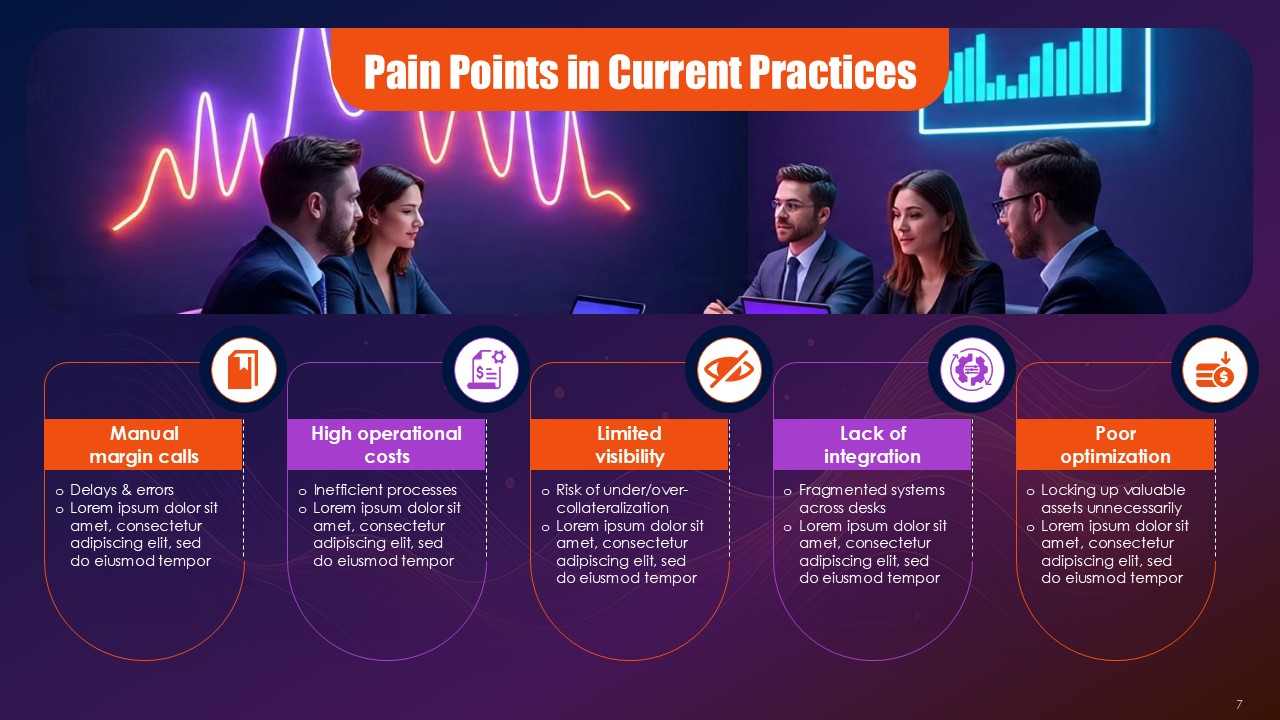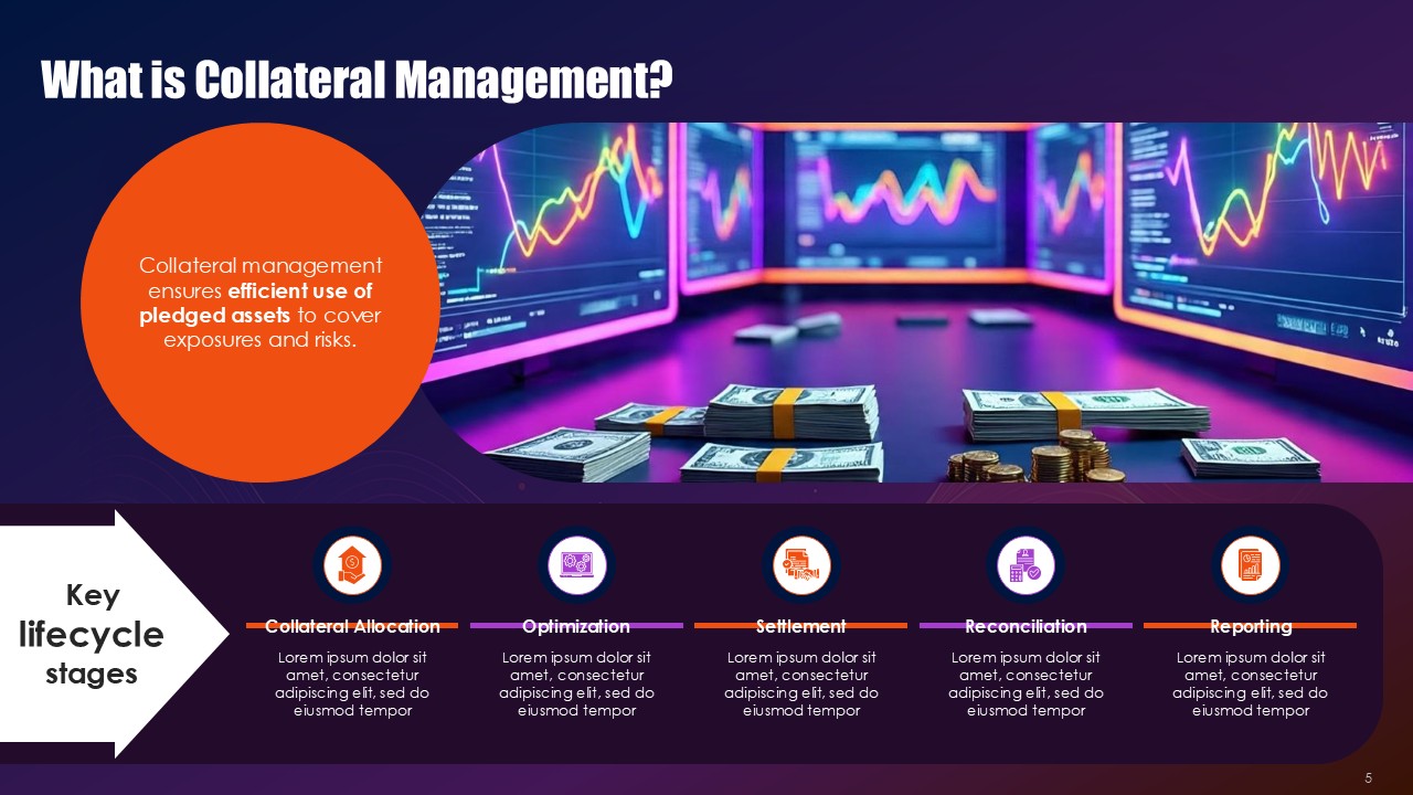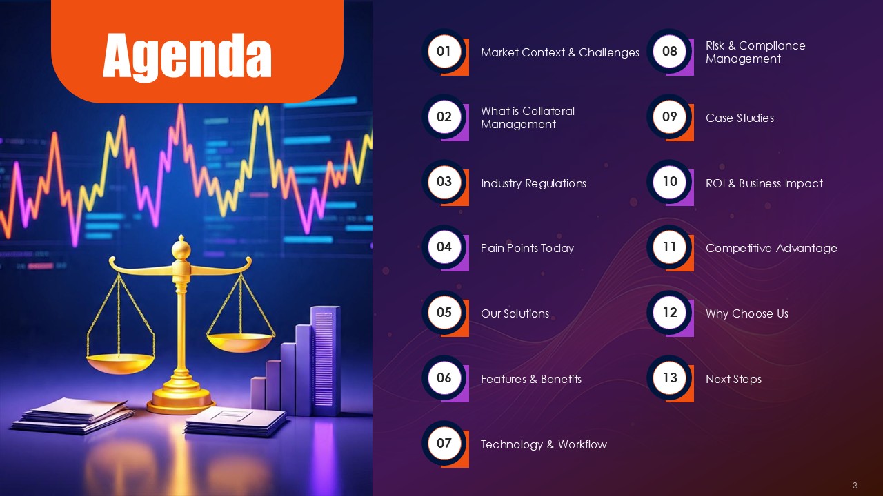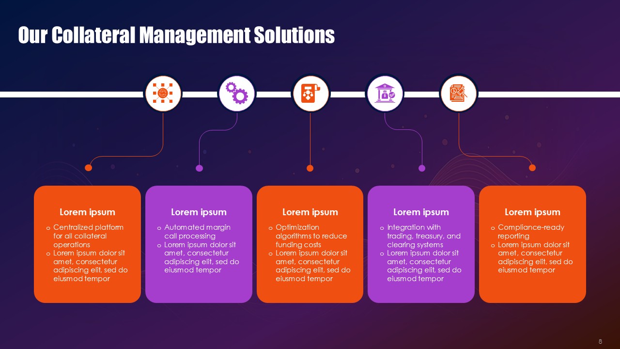 Black provides financial authority and rigorous framework across the border and within the process, orange highlights signals where collateral health is deteriorating and critical exposure thresholds, and purple provides elevation for the strategies and innovative solutions for hedging. This triad operates as visual semiotics. Black frameworks resting along the practice of compliance with regulation provide the anchor, orange the pathways of purple that demand immediate action to mitigate the critical problems, and purple offer sophisticated mitigation architectures for the problems. The Collateral Risk Management Solutions PPT Presentation uses the triad as a spectrum to make action inevitable and risk real.
