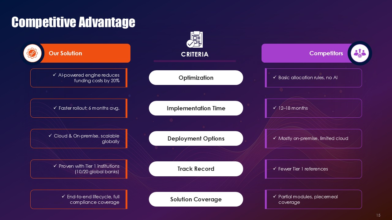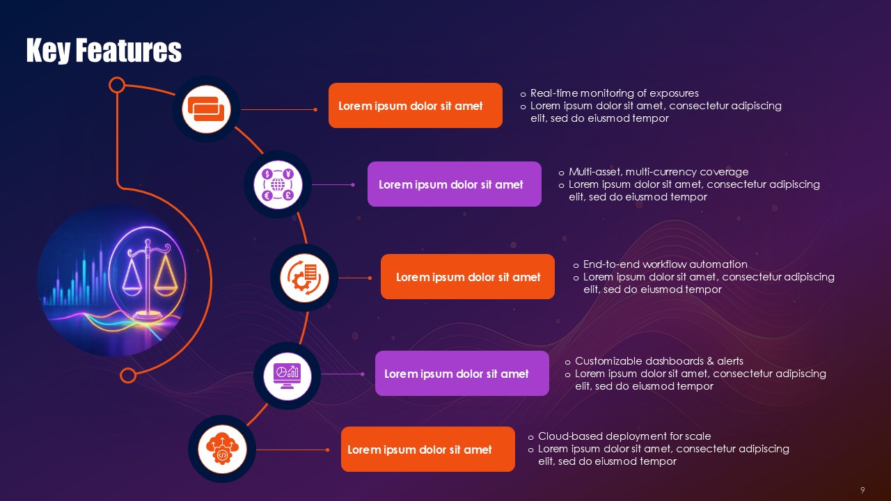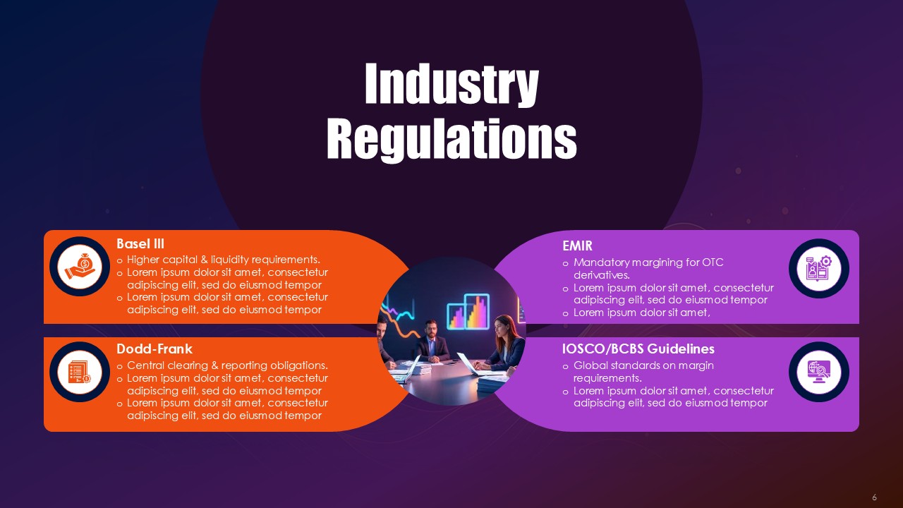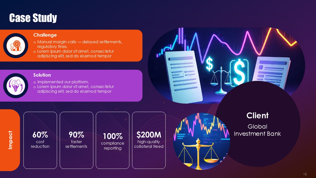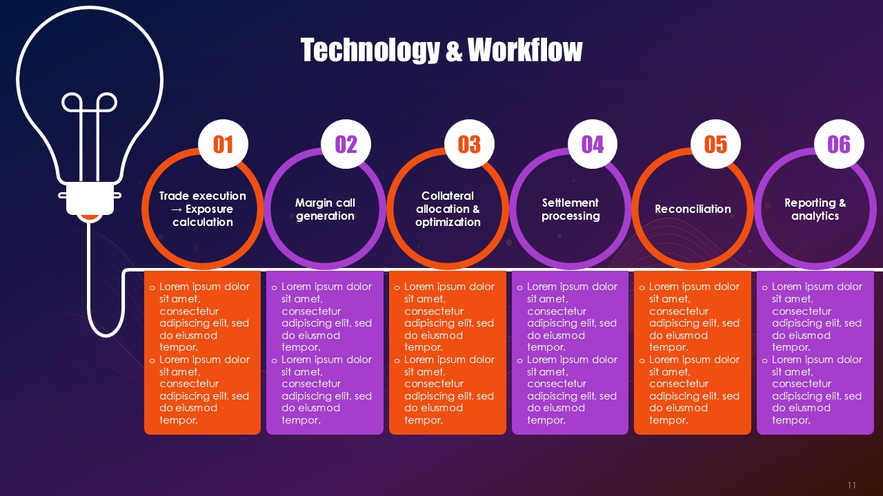 Black provides financial authority and rigorous framework across the border and within the process, orange highlights signals where collateral health is deteriorating and critical exposure thresholds, and purple provides elevation for the strategies and innovative solutions for hedging. This triad operates as visual semiotics. Black frameworks resting along the practice of compliance with regulation provide the anchor, orange the pathways of purple that demand immediate action to mitigate the critical problems, and purple offer sophisticated mitigation architectures for the problems. The Collateral Risk Management Solutions PPT Presentation uses the triad as a spectrum to make action inevitable and risk real.