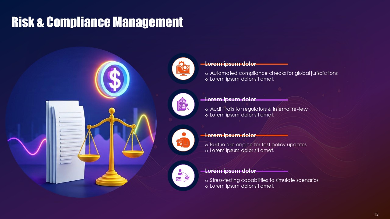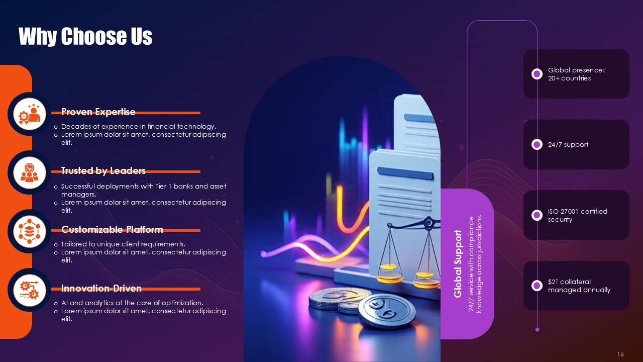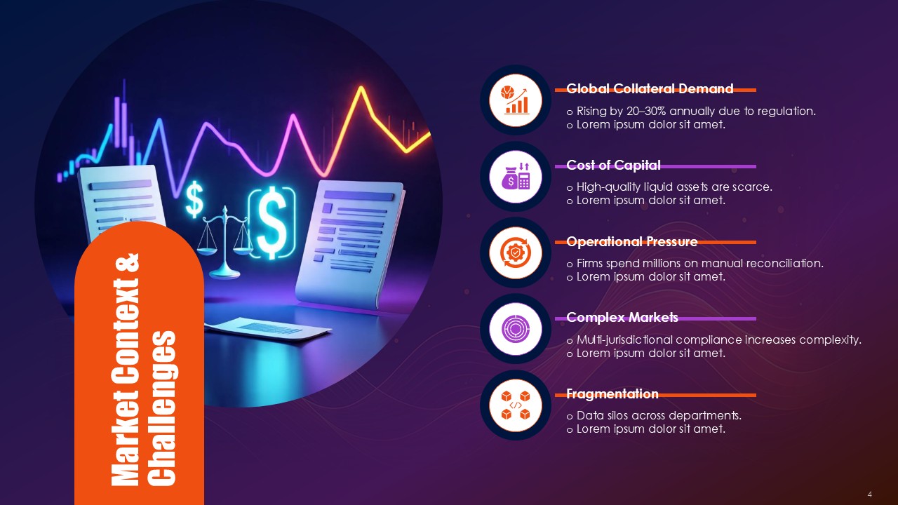 The Collateral Risk Management Solutions PPT Presentation provides a sophisticated 19-slide framework capturing the challenging collaterized credit risk problems along with the asset security challenges and provides actionable transform strategies ready for the boardroom. Dressed in an authoritative outfit of black interspersed with vibrant signals of orange and overlays of sophisticated purple, this premium template empowers the financial sectors, risk management officers, and business executives with the ability to articulate the methodologies of collateral protection with absolute precision and unmatched confidence. The Collateral Risk Management Solutions PPT Presentation provides intricate risk data in a manner that is woven with security and foresight, whether it is the evaluation of a loan to value ratio, the assessment of margin requirements and portfolio of differentiated assets under stress testing, or any other margin risk governing activity.