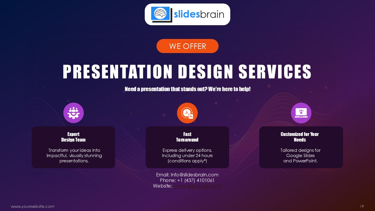 Looking for a slide or PPT that’s uniquely yours? Our presentation design agency is here to help make your ideas a reality. As a leading presentation design company, we focus on delivering premium-grade bespoke presentations that engage your audience and ensure message retention. Kindly get in touch with us for professional custom presentation design services and transform your brand’s message for the purpose that you have in mind.