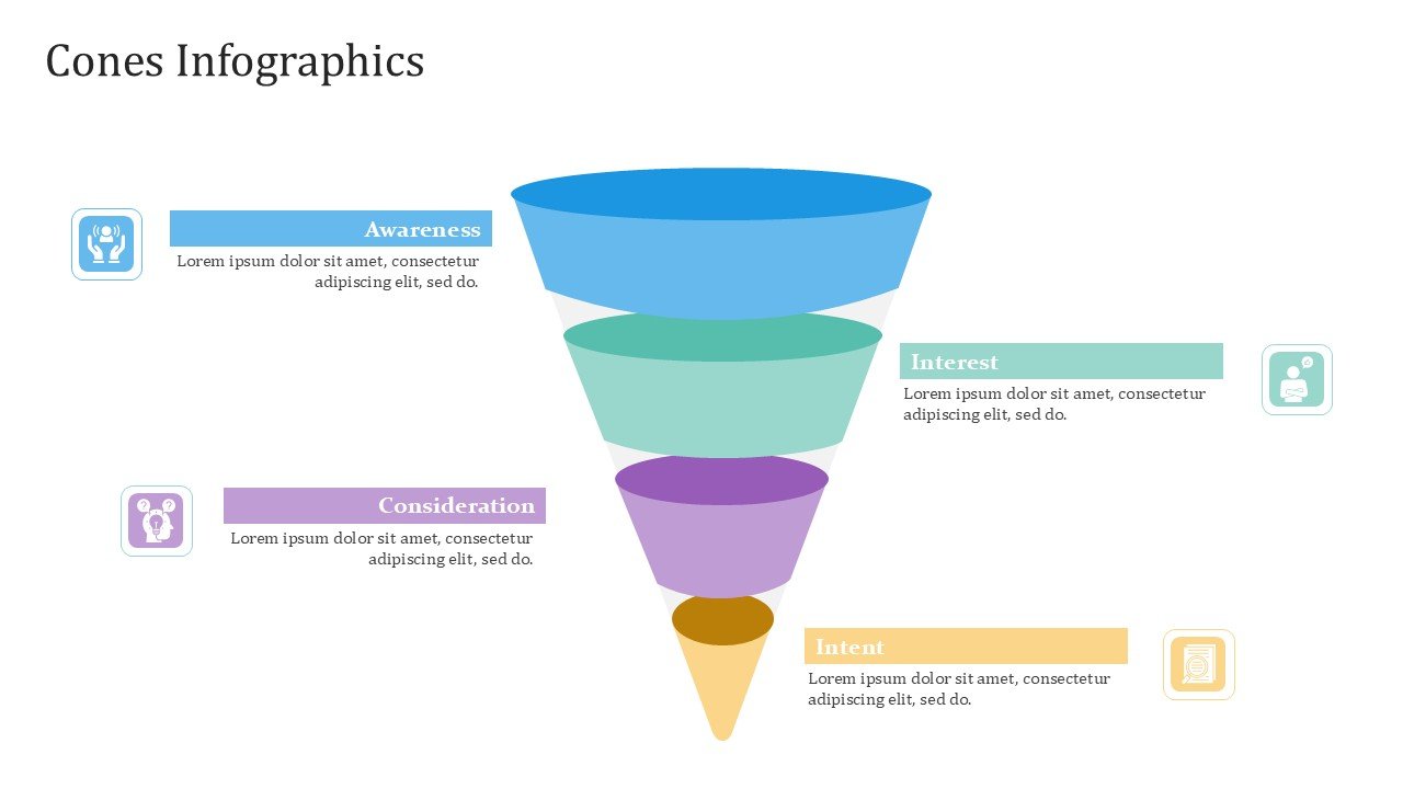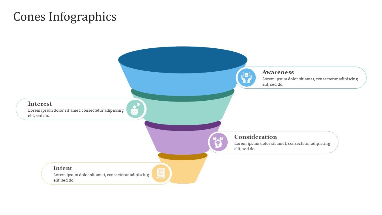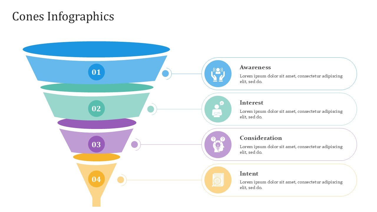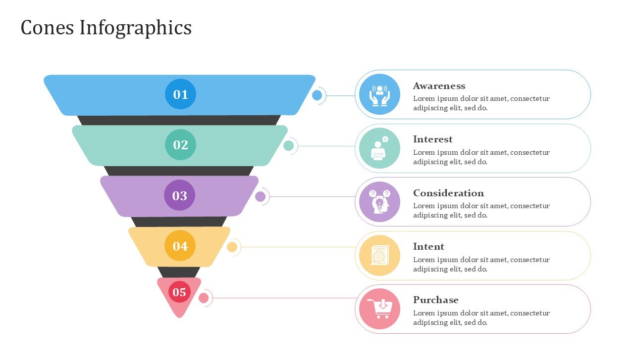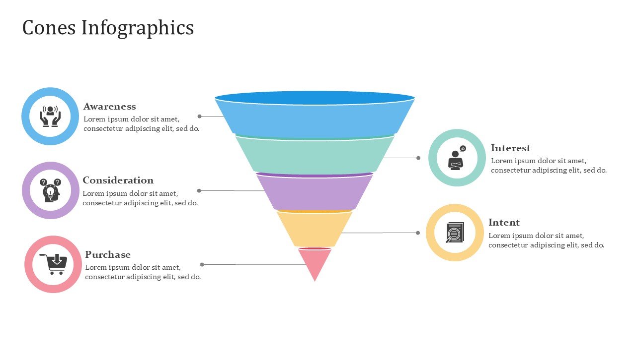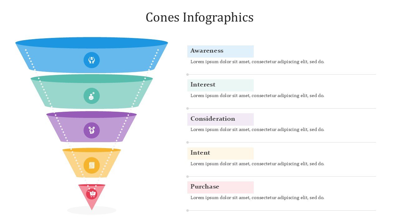 Cones PPT PowerPoint Infographics – 20 Slides is a premium fully editable PowerPoint template infused with modern info-graphic designs to showcase data and information in a creative way. With a presentation pastel color scheme of blue, green, yellow, red, and purple, makes it suitable for creative, professional, and academic purposes where visually engaging slide designs are central to the projects.