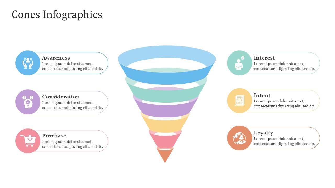 Cones PPT PowerPoint Infographics – 20 Slides comes with 20 unique customizable slides that contain different cone-shaped info-graphics to ease the visualization of data, processes, comparisons, and hierarchies. The slides are colored in vibrant pastel tones to yield a professional and clear presentation, while still capturing the attention of the audience.