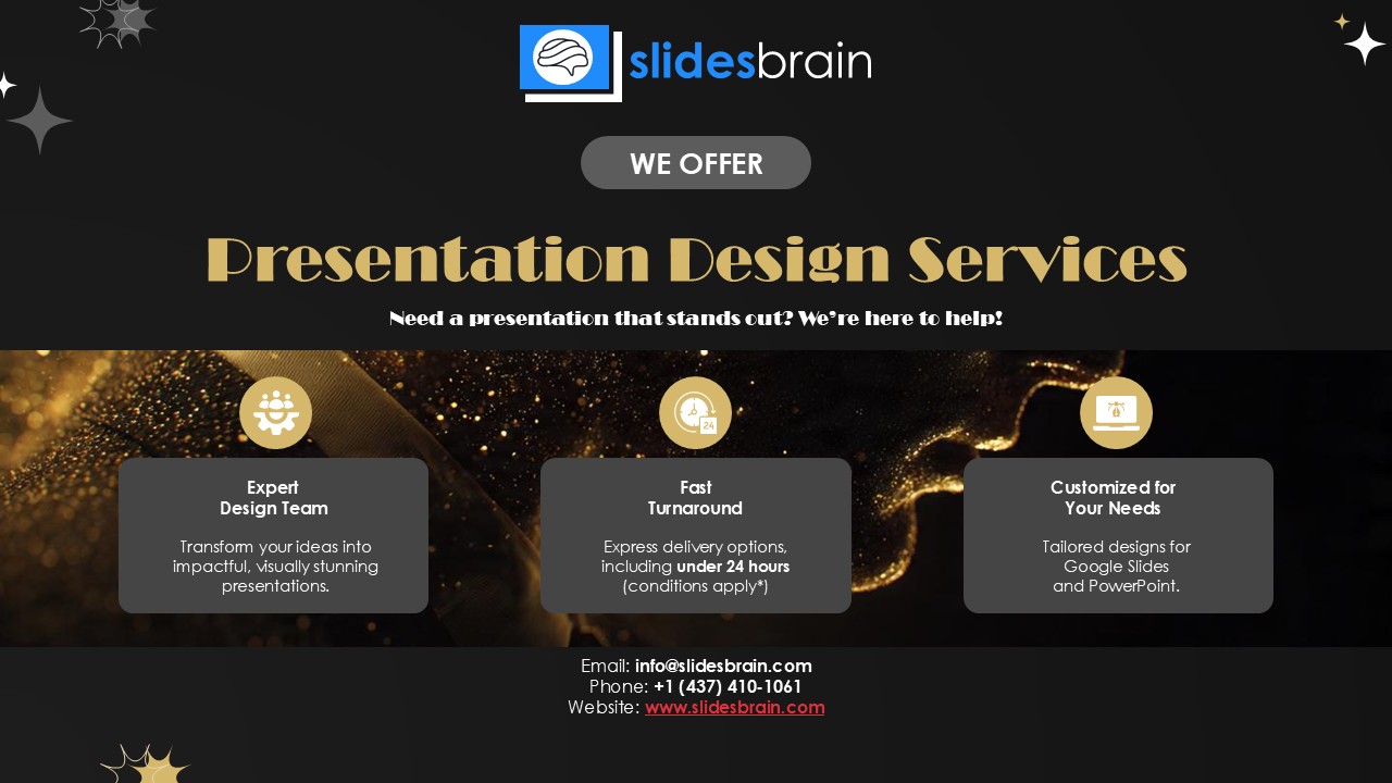Looking for a slide or PPT that’s uniquely yours? Our presentation design agency is here to help make your ideas a reality. As a leading presentation design company, we focus on delivering premium-grade bespoke presentations that engage your audience and ensure message retention. Kindly get in touch with us for professional custom presentation design services and transform your brand’s message for the purpose that you have in mind.