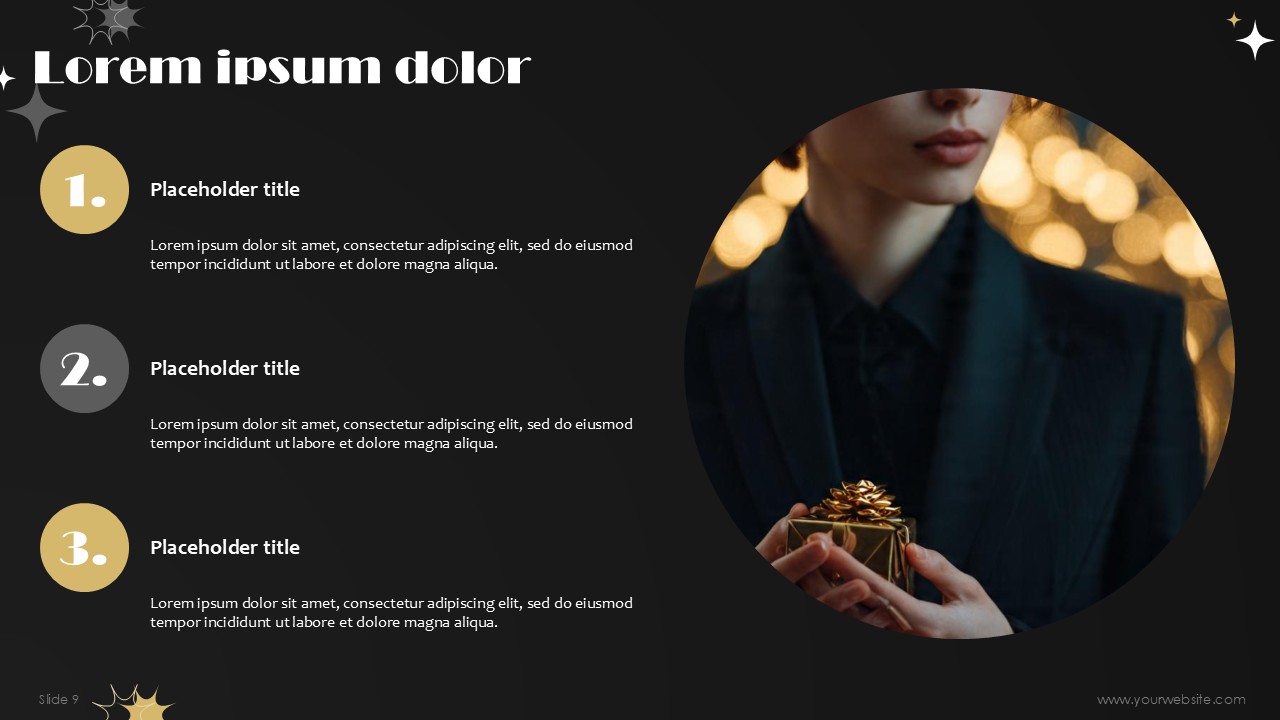 The Corporate Christmas Holiday Powerpoint Template features a color scheme that instills confidence and positive energy. The color palette consists of corporate black, soft grey, celebratory yellow, and gold. The black and grey convey corporate professionalism and the gold and yellow celebrate seasonal luxury and joy. The color scheme brings the perfect amount of corporate credibility and festive celebration and conveys visual professionalism and joy throughout the Corporate Christmas Holiday Powerpoint Template.