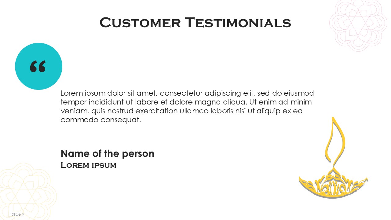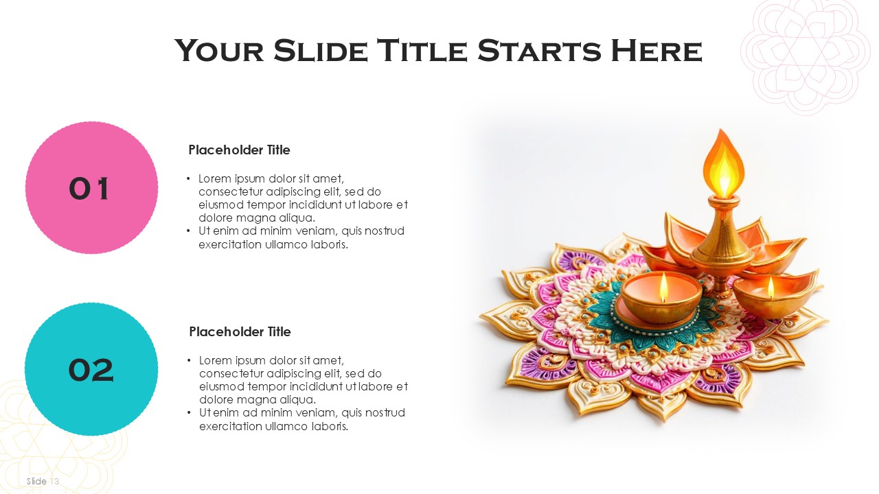Express the spirit and significance of Deepawali using the free and customizable Deepawali: A Festival of Lights Presentation Template. This presentation tool works above and beyond with Microsoft PowerPoint and Google Slides. This tool is developed with the intention of educating and motivating users, allowing users to create beautiful presentations that captivates audiences everywhere with its balance between rich tradition and contemporary themes of hope, prosperity, and inner enlightenment. Includes 19 customizable slides that can be used in the classroom, the office, or your community. No design expertise is needed.