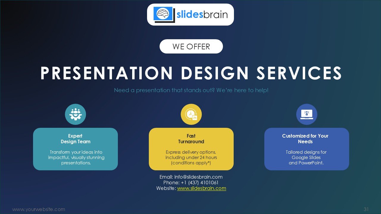Looking for a slide or PPT that’s uniquely yours? Our presentation design agency is here to help make your ideas a reality. As a leading presentation design company, we focus on delivering premium-grade bespoke presentations that engage your audience and ensure message retention. Kindly get in touch with us for professional custom presentation design services and transform your brand’s message for the purpose that you have in mind.