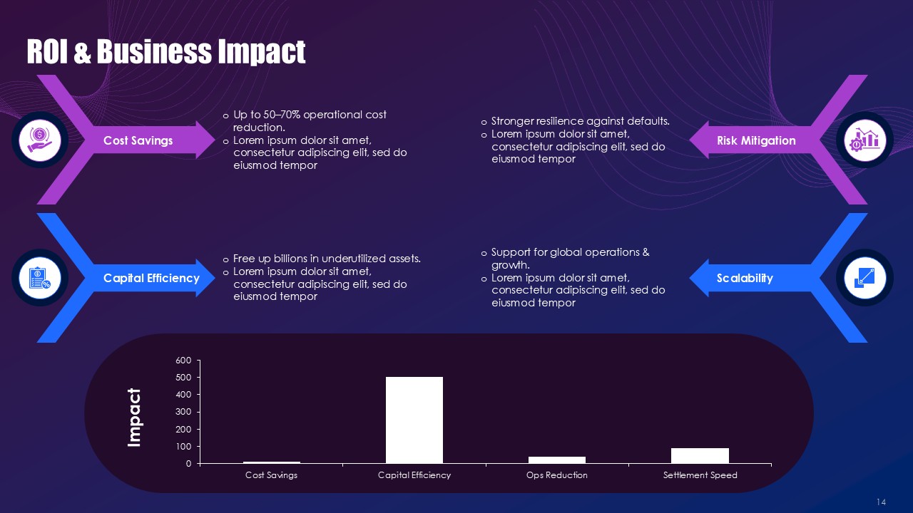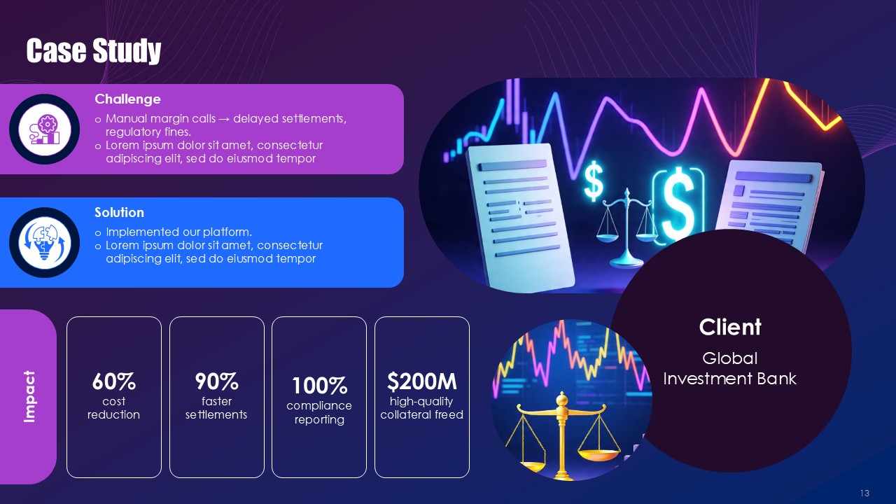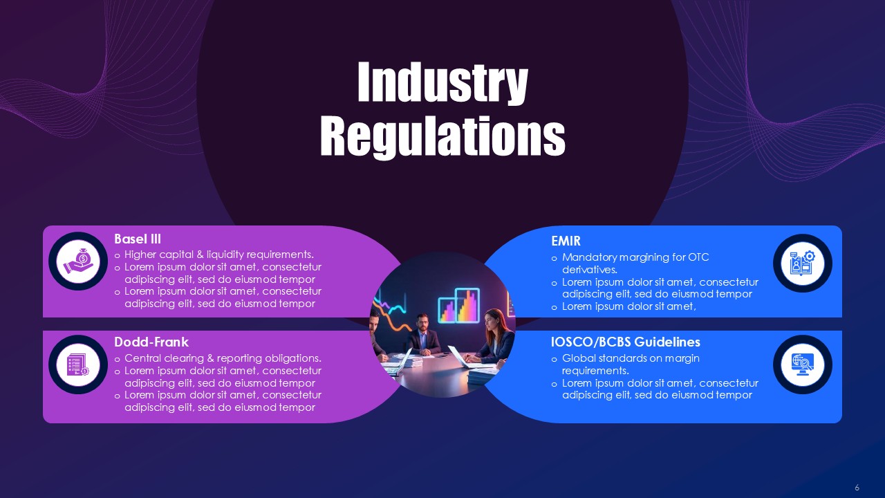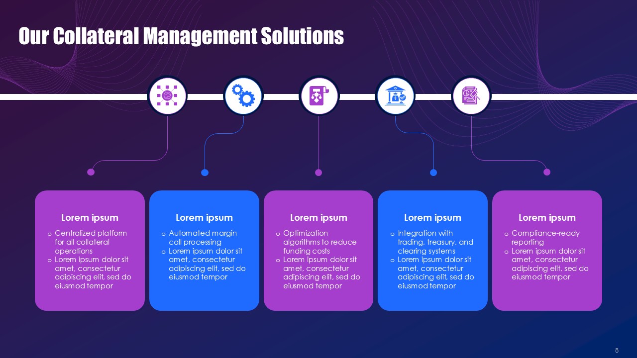 The neon texts of the prism slides are accompanied with clean hypermodern 3D and 2D infograph imagery of trust, intelligence, and stability blue with ultrasonic sockets of saturated purple as the rich depth, innovative fintech tell you that strategic focus to match the sleek photonic with blue purple neon blade information streams. These modules are rich due to the complimented hypermodern neon scheme of focus point data which allows you to highlight your statements effortlessly. Collateral asset classification, margin requirements, counterparty risk, regulatory compliance, un-sleeved clearing processes, and automated optimizing of collateral sets with the ecosystem modules become effortless for internal reports, executive briefings, client leads, or investor hypermodern updates.