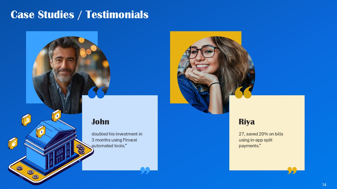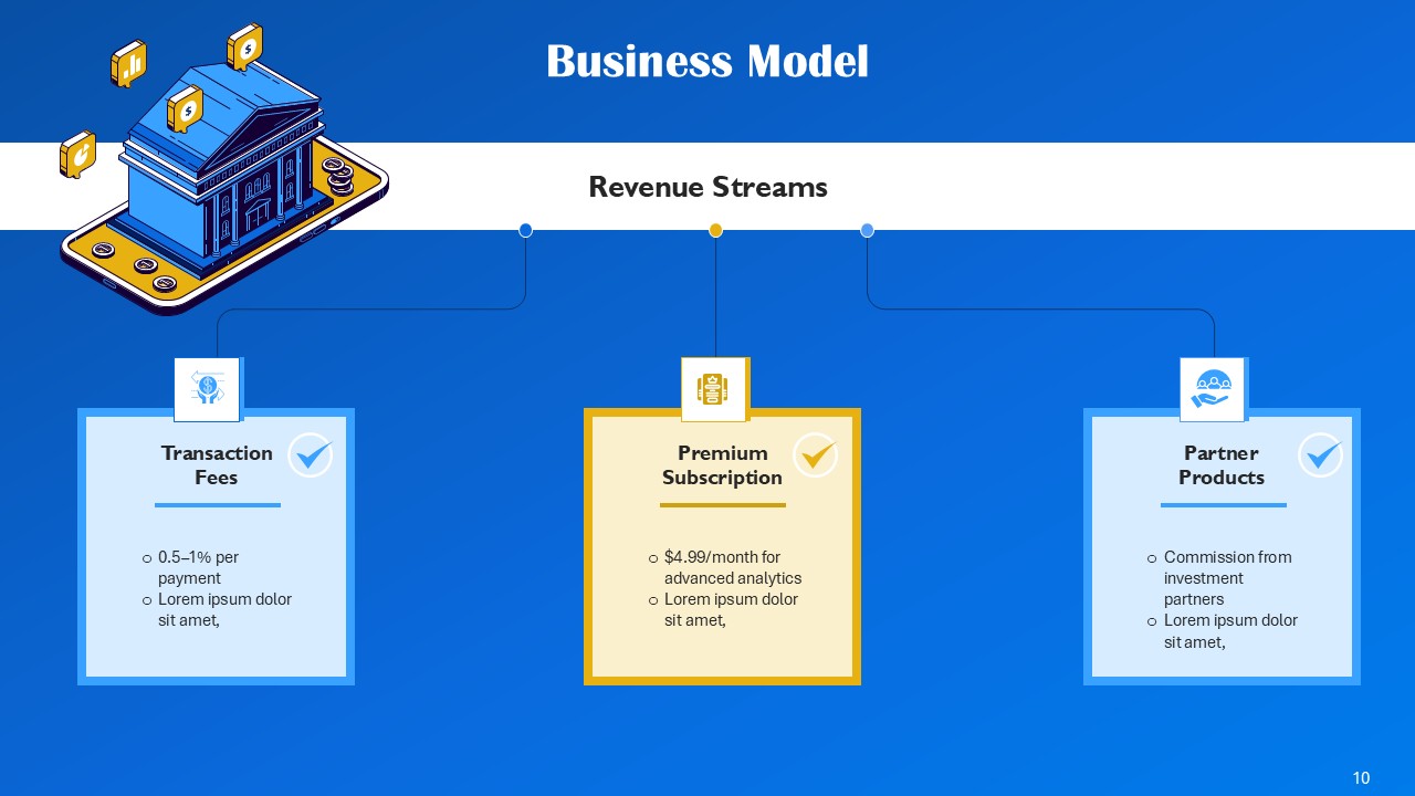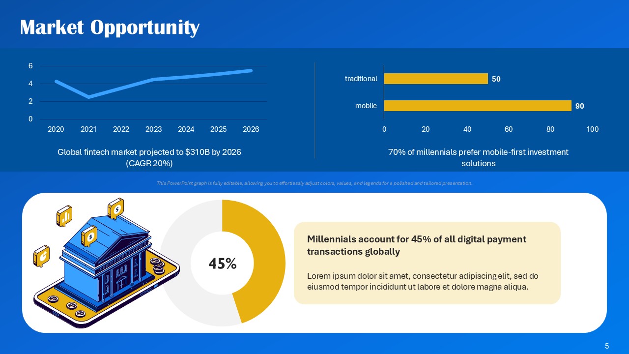The Finvest Millennial Finance and Smart Money Management Presentation template consists of an elegant and seamless 22 slides template designed to captivate the attention of the modern-day audience with storytelling details and vibrant data commercials. The presentation template includes a lively palette of optimist yellow and trust blue. With a vibrant recording of an animated bank facade and stacks of money, the presentation template dazzlingly comes alive and welcomes the audience with warm colors. Fintech disruptors, wealth management and financial educators, the presentation template offers the structural and visual toolkit designed to enlighten a contemporary audience with investing, financial literacy, and money management seamlessly.