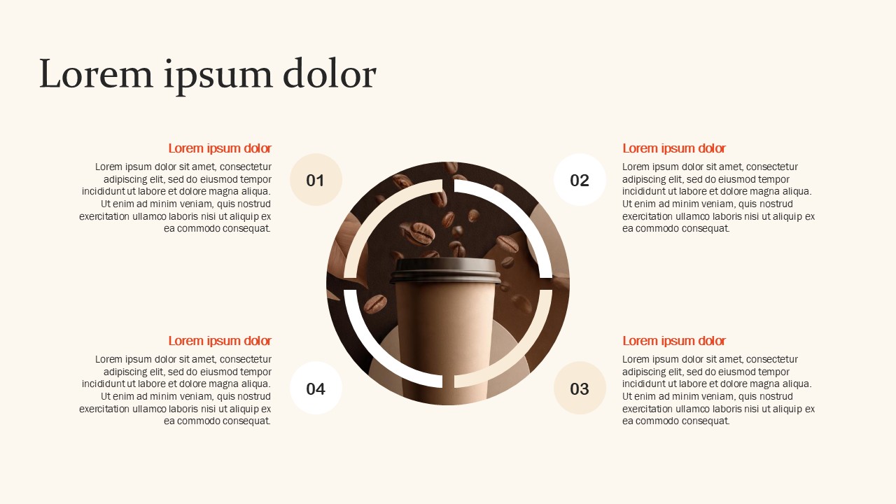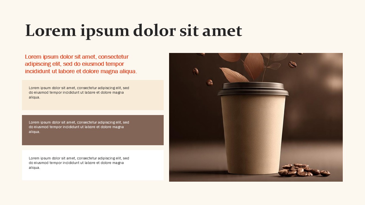 In the Free Coffee Business Template PowerPoint Presentation, this free template also features a zero defecation design philosophy, which is when a large area of the slide is empty. A free coffee template is another testament to this template’s philosophy. Featuring generous amounts of whitespace to prevent slide overcrowding, readers will have enough room to process and take in the information presented to them. The template structure guides listeners by providing the slides with the focused content, and adding structure to take listeners through a seamless narrative, but without any visual distractions in the design. Each slide offers sleek column showcases for the listed content such as a product with a column for a product image.