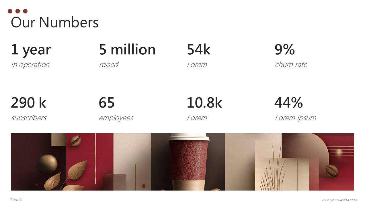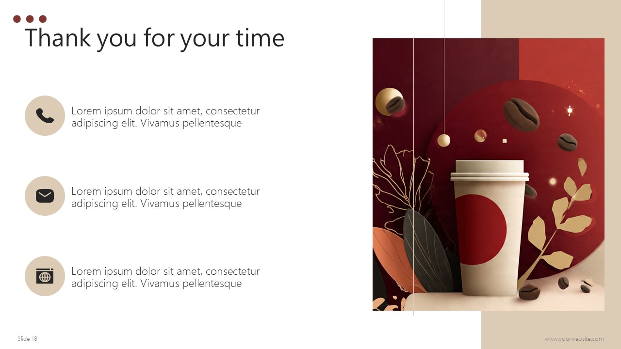 The combination of cream and red and brown colors harmoniously together is intentional because cream represents the product being pure and fresh while being of high quality. Passion and artistry are tied to the red from the culture surrounding artisanal coffee while brown is the color of the coffee bean and represents the focus of the company. All these colors complement each other because of the artistry and emotion behind it and the warmth of the coffee. Every color and element intertwines to create an emotion driven presentation. We offer a Free Premium Coffee Template PowerPoint Presentation because it embody’s our mission statement and values.