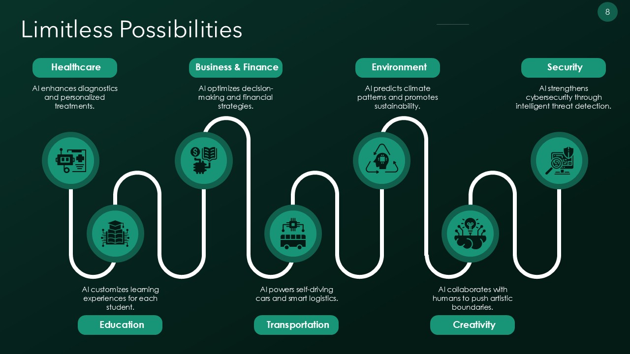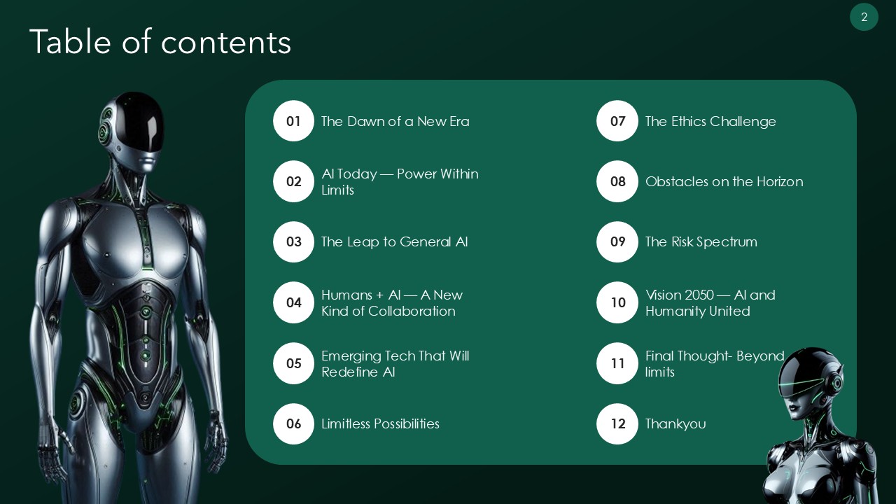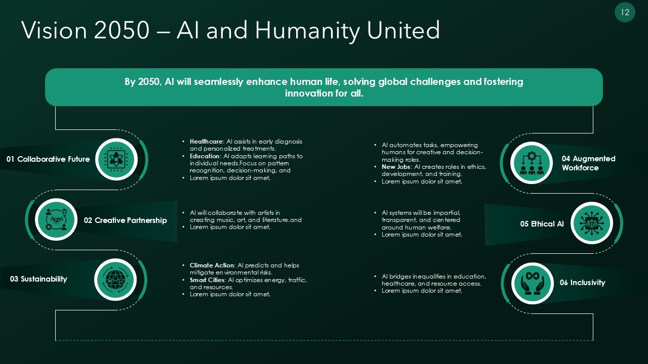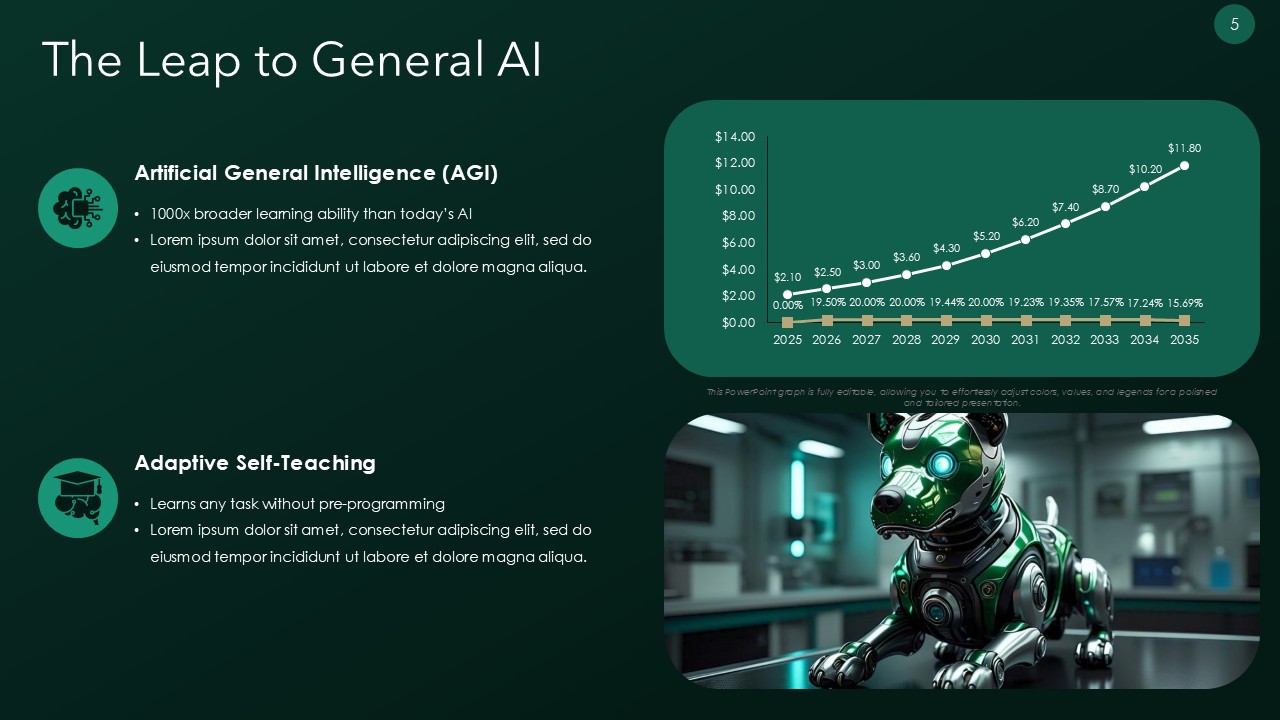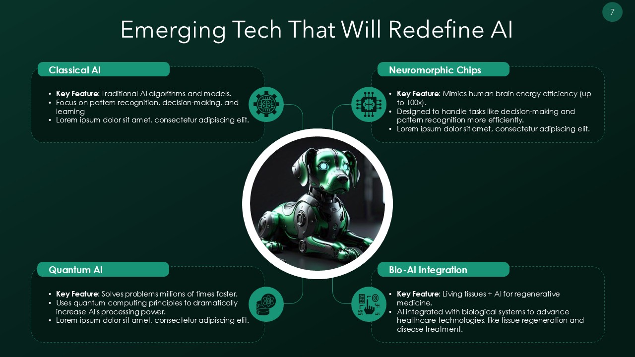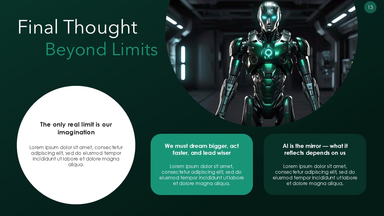 The green and black color scheme is striking. Green represents growth, limitless potential, adaptable systems, and cognitive systems, while black stands for depth, the unknown, computational intelligence, and machine consciousness. This visual contrast underscores invigorating the prospect of future machine consciousness. The Future of AI Beyond Imagination Presentation Template maintains this balance, tinged with reverence for the implications of AI.