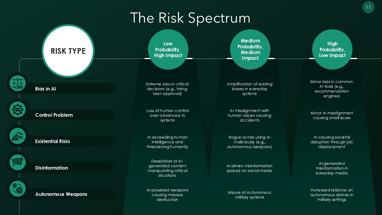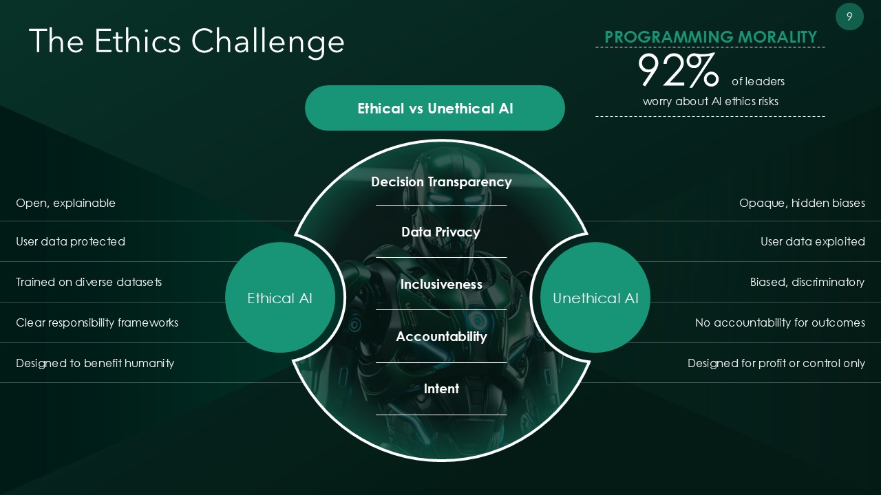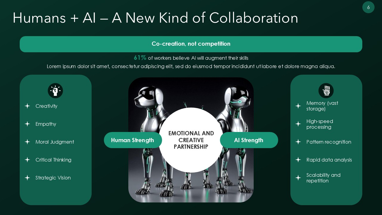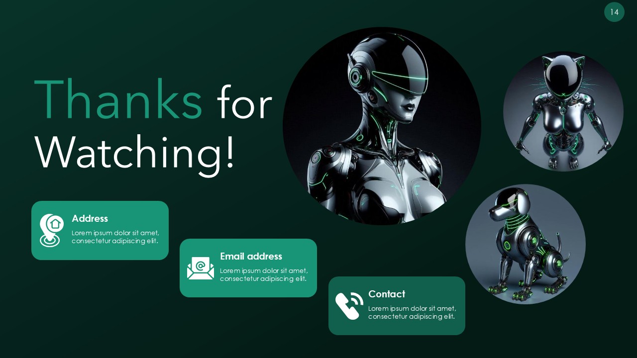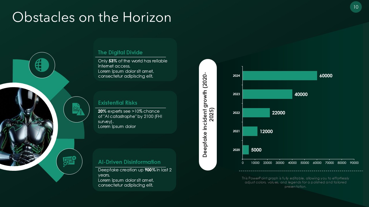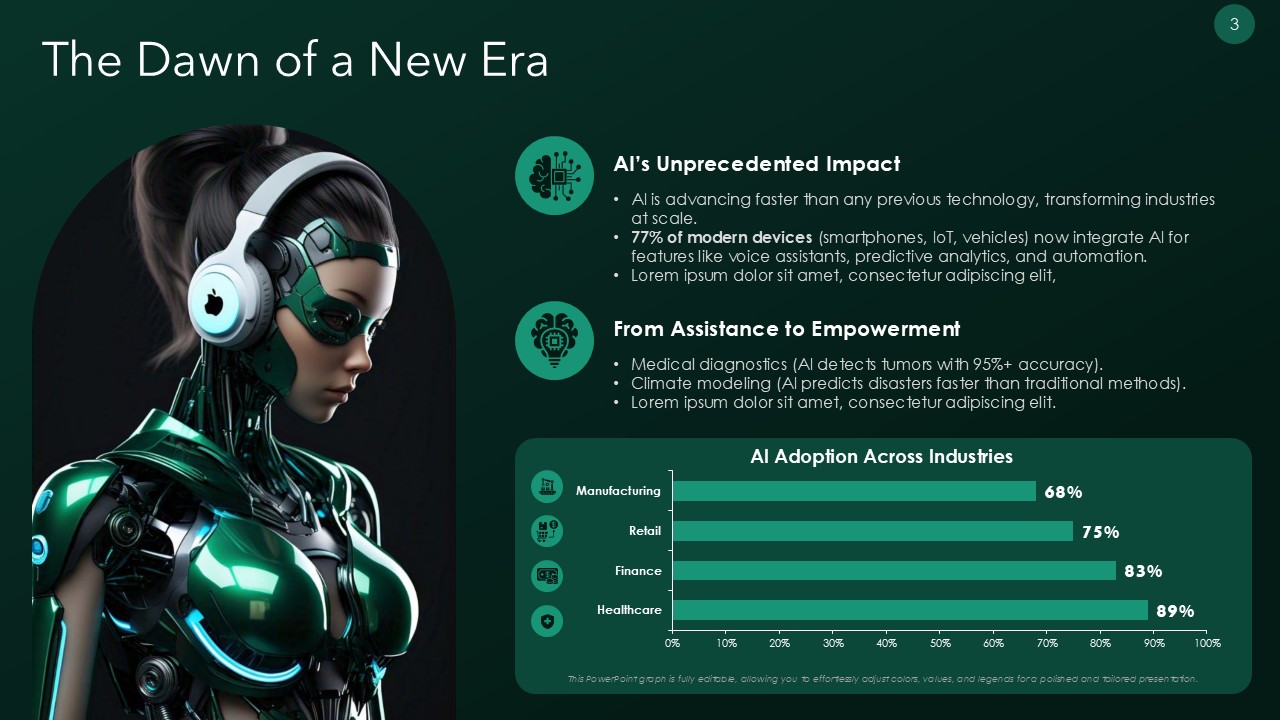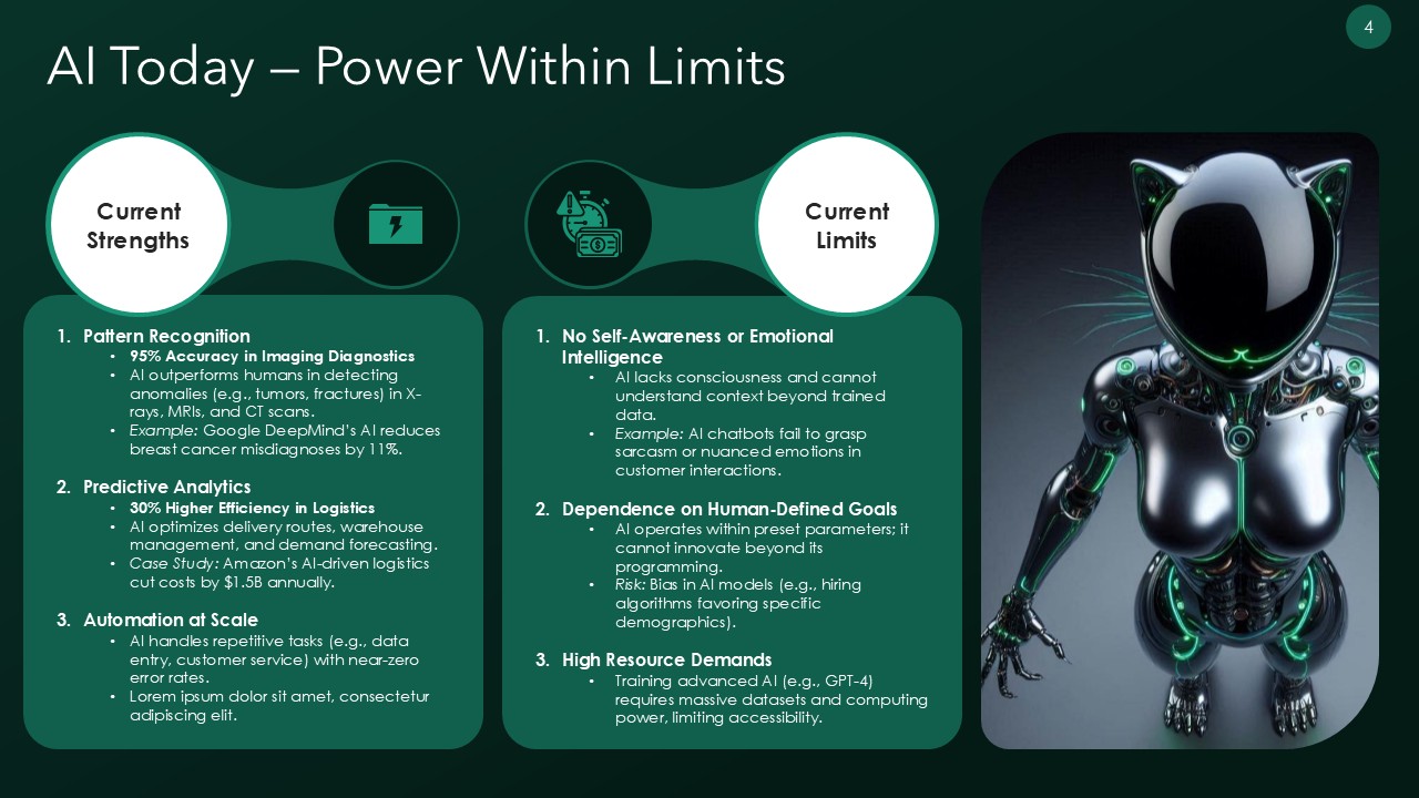 The green and black color scheme is striking. Green represents growth, limitless potential, adaptable systems, and cognitive systems, while black stands for depth, the unknown, computational intelligence, and machine consciousness. This visual contrast underscores invigorating the prospect of future machine consciousness. The Future of AI Beyond Imagination Presentation Template maintains this balance, tinged with reverence for the implications of AI.