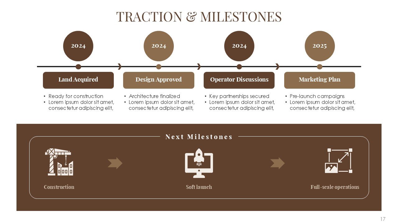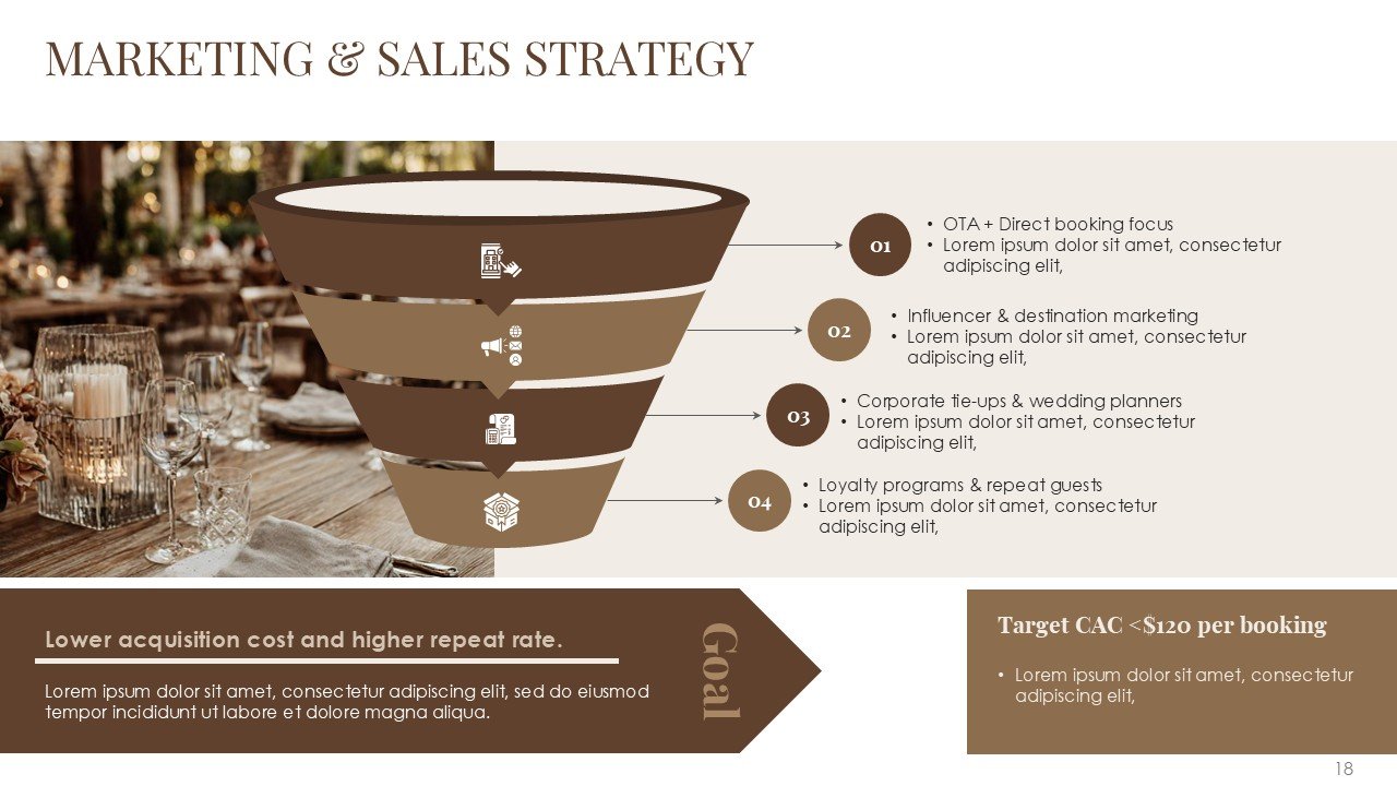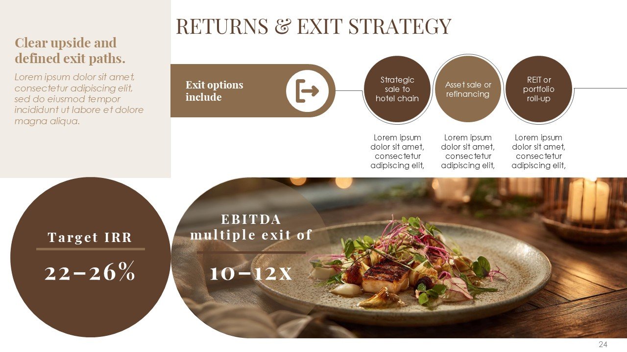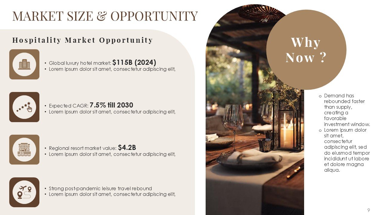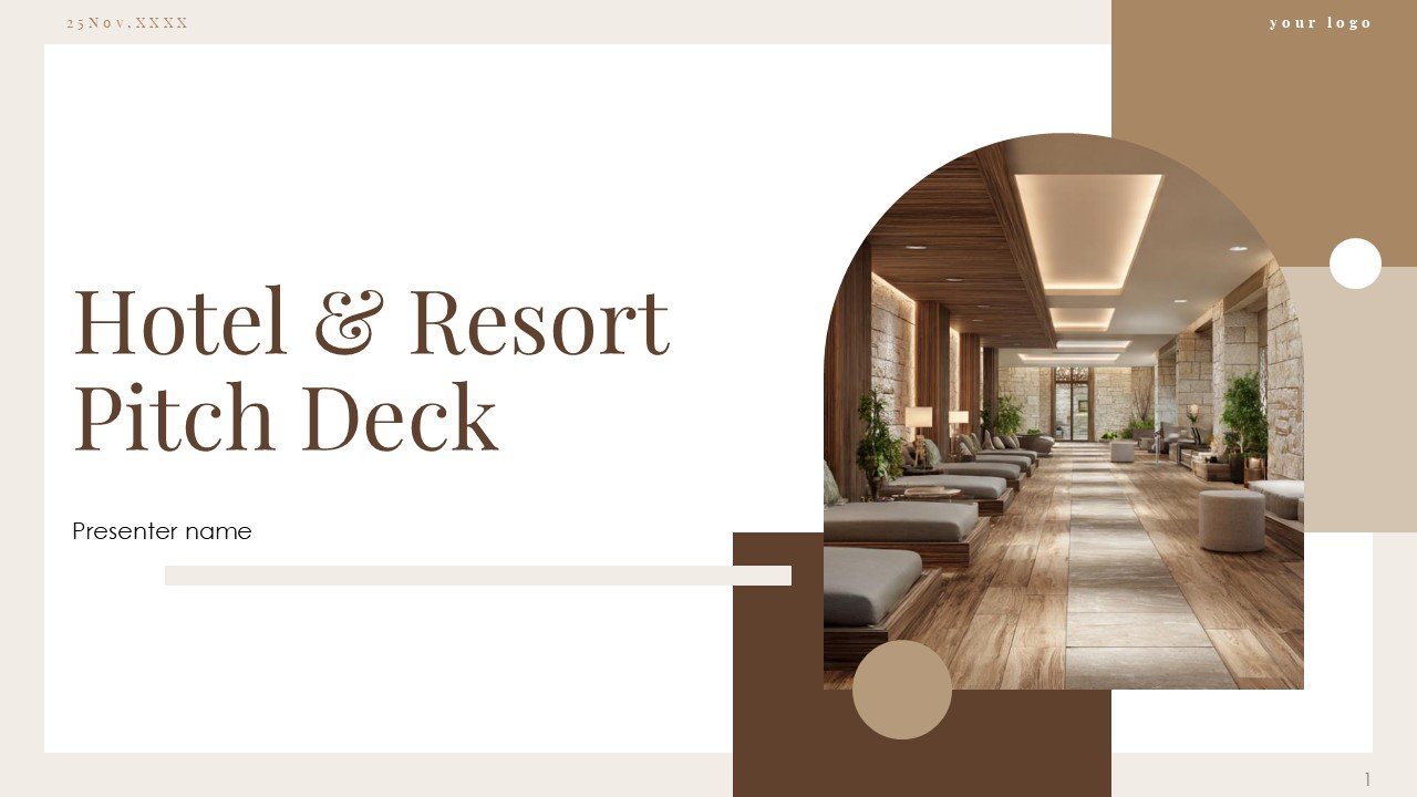The Hotel and Resort Pitch Deck PPT Presentation Template is a 30-slide premium template for hospitality businesses, luxury resorts, boutique hotels, and tourism startups. It has a refined brown color palette and a balanced minimal and geometric design, providing a sophisticated and professional template for investor and business presentations.