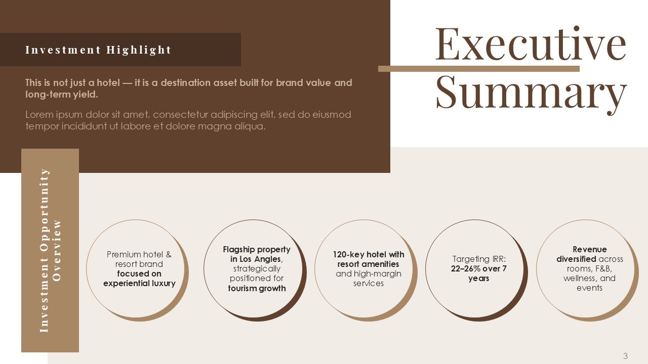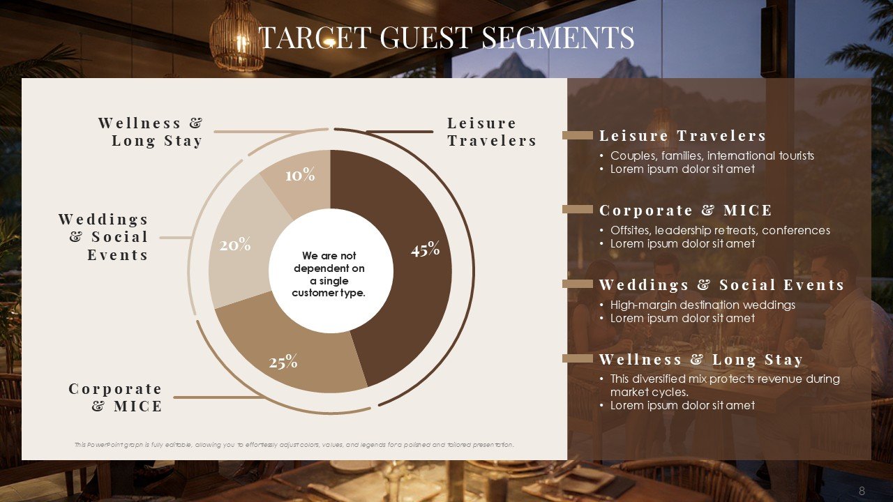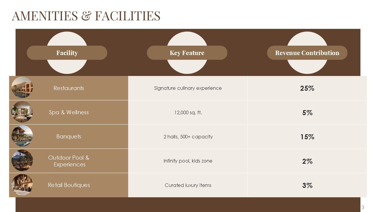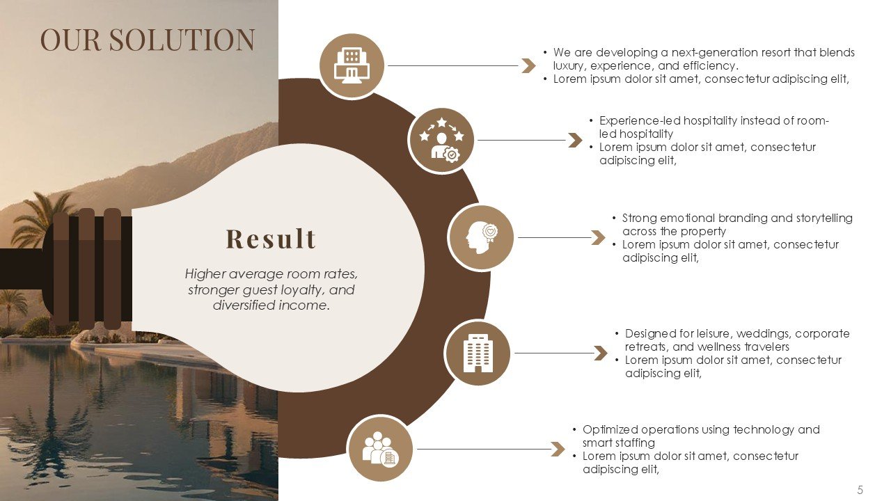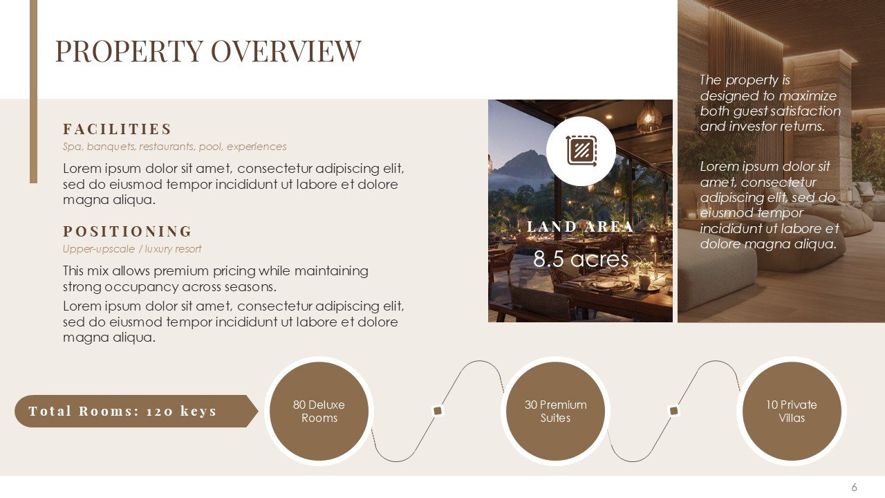 This premium PPT template assists you in confidently and clearly communicating your vision, whether it be pitching a luxury resort, presenting a hotel investment proposal, starting a hospitality business, or highlighting a redevelopment project.