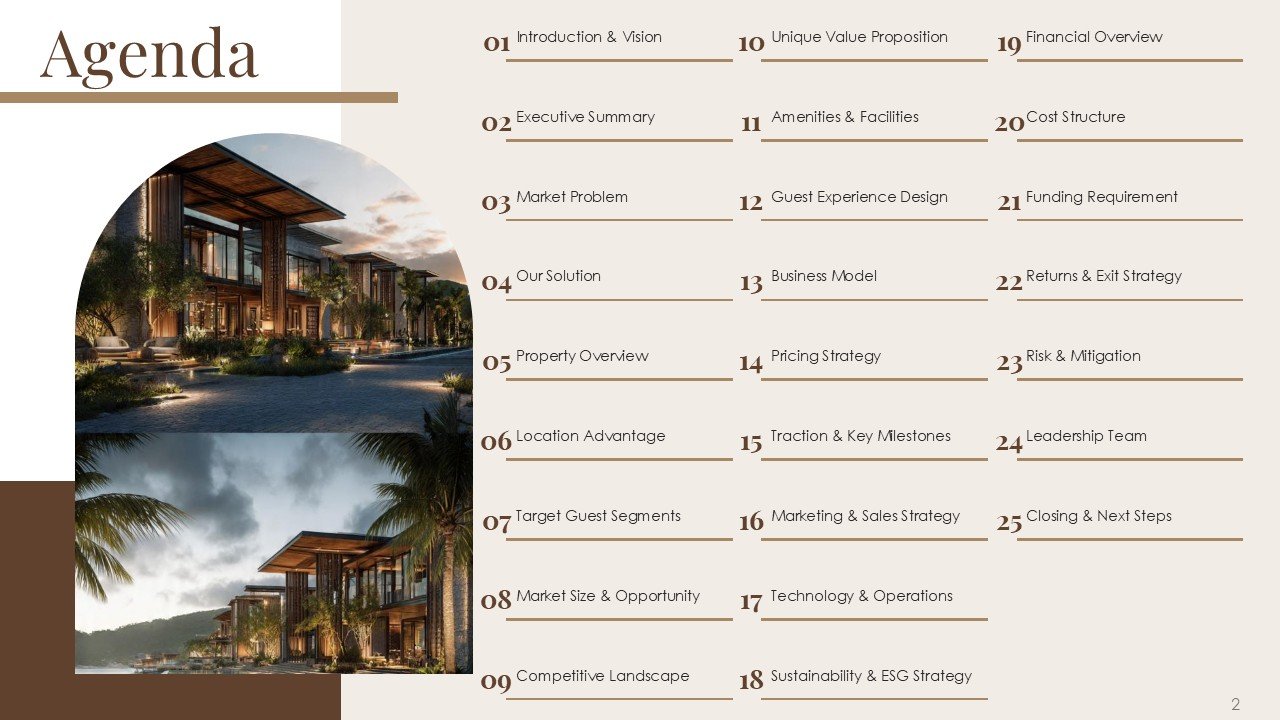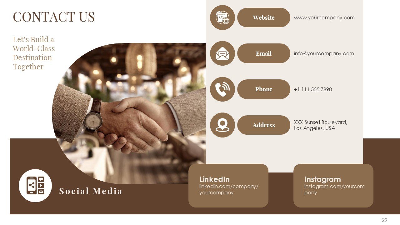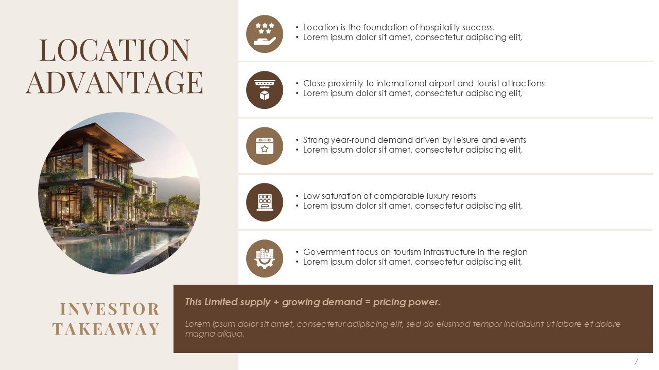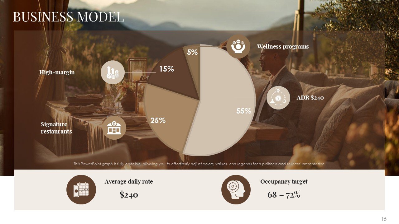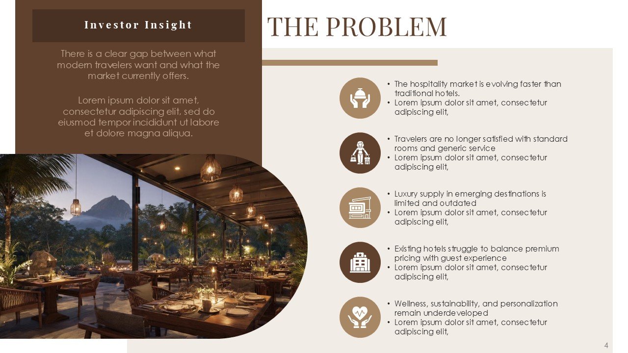 This premium PPT template assists you in confidently and clearly communicating your vision, whether it be pitching a luxury resort, presenting a hotel investment proposal, starting a hospitality business, or highlighting a redevelopment project.