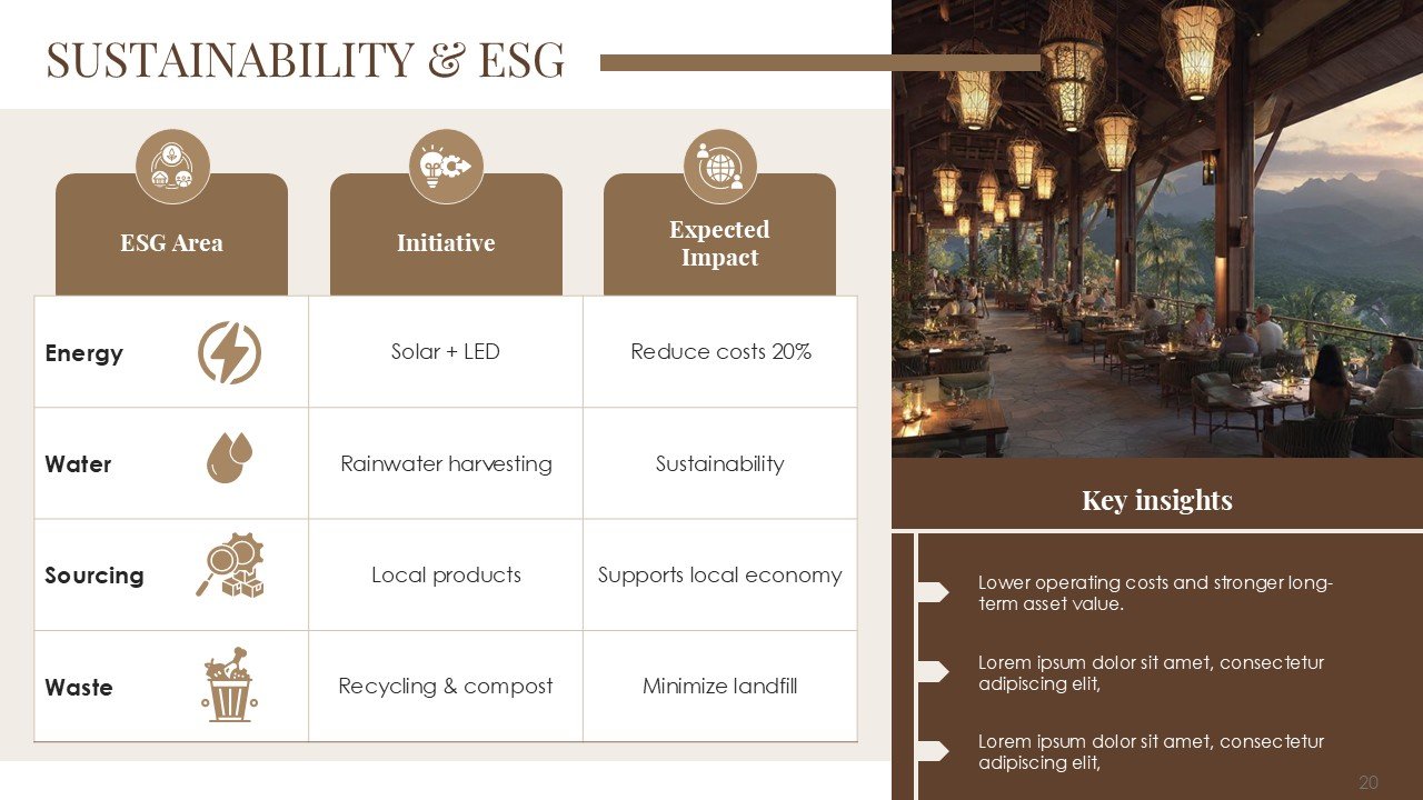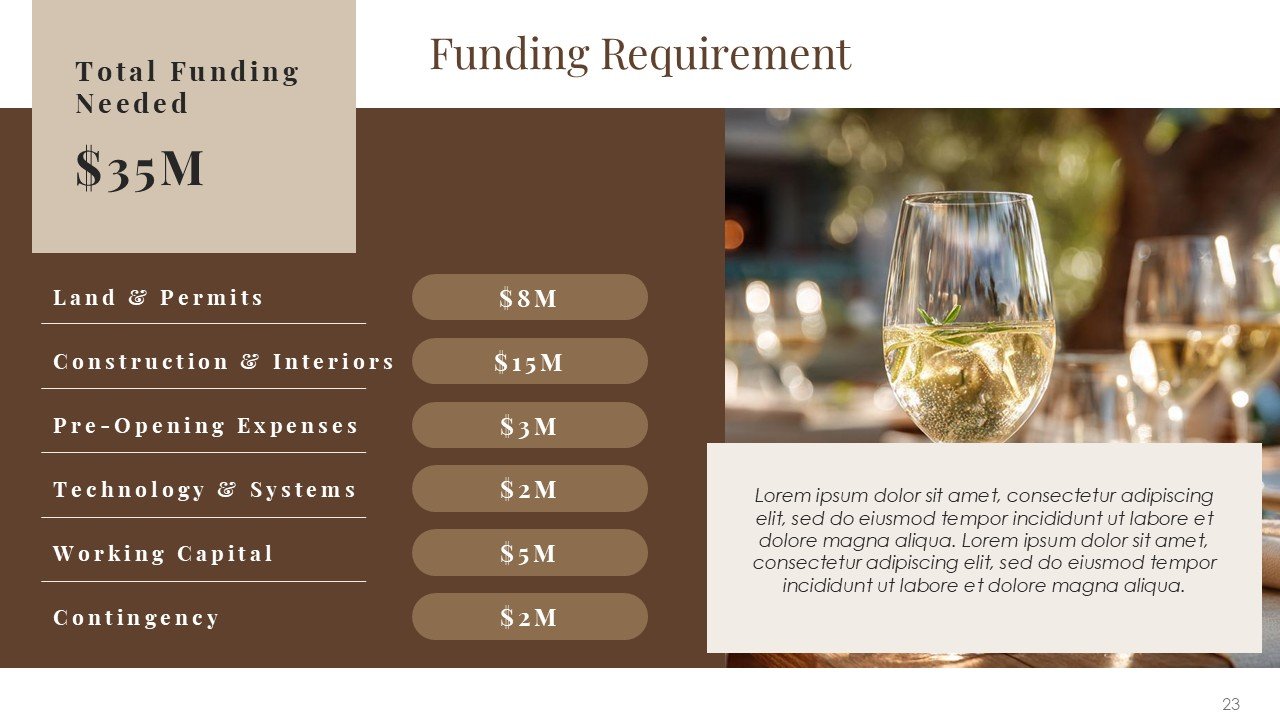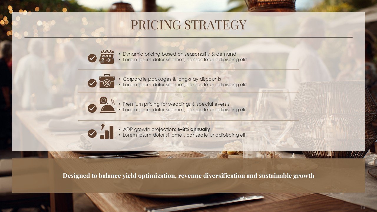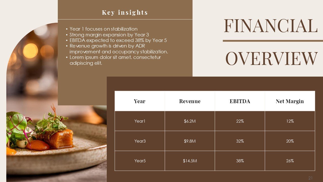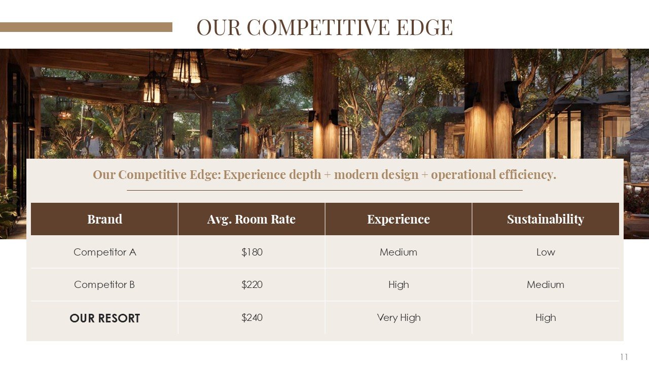 This premium PPT template assists you in confidently and clearly communicating your vision, whether it be pitching a luxury resort, presenting a hotel investment proposal, starting a hospitality business, or highlighting a redevelopment project.