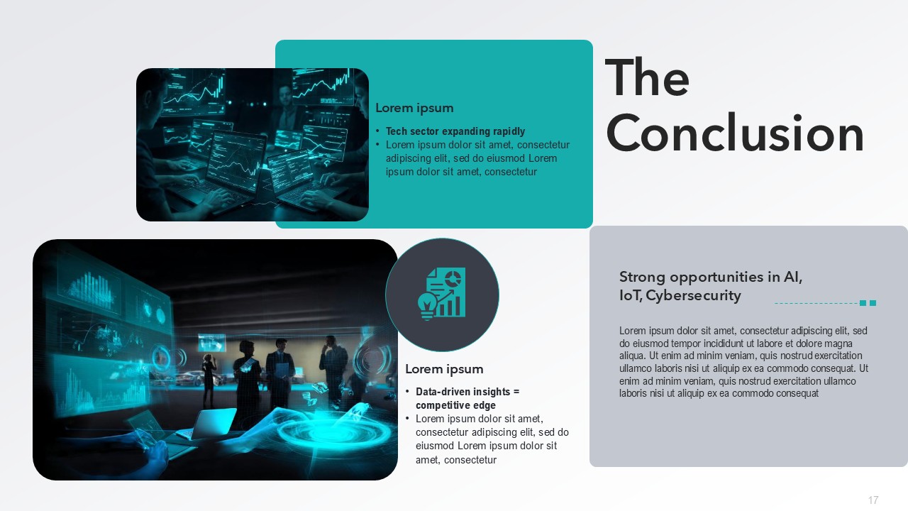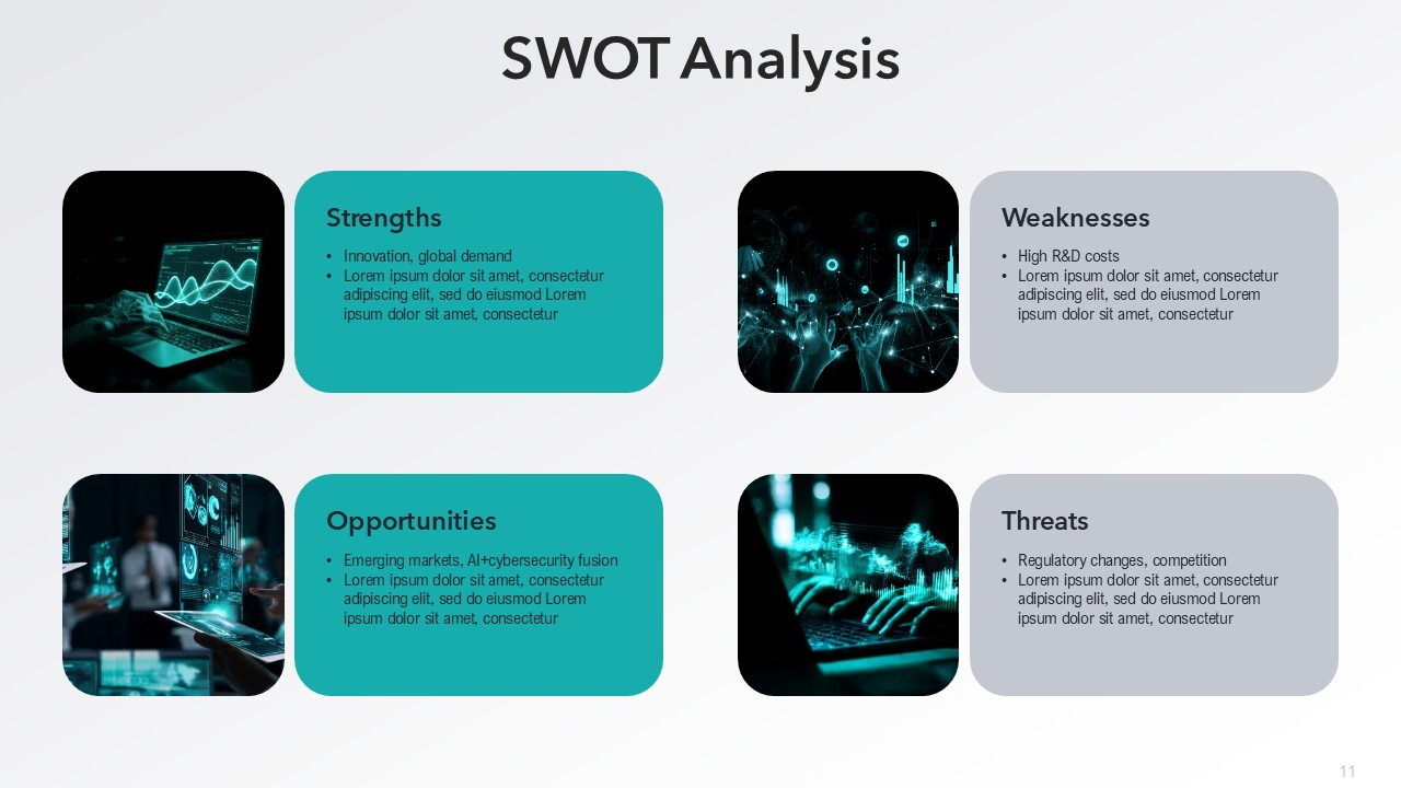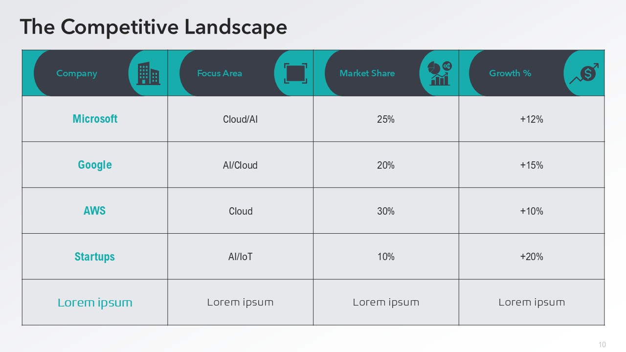 Grey defines technical credibility and the reliability of the infrastructures, black articulates product sophistication and the dominance of the market, and cyan is an indicator of innovation and the digital transformation of the world. This chromatic approach works with mathematical pinpoint accuracy; grey backgrounds form technical and neutral canvases, black type weight anchors feature specifications with weight and domination, while cyan elements light up the differentiators and competitive advantages. This is why The Information Technology Project Pitch Deck is able to strategically use this geometric color application to help the audience feel the tension between being grounded and being visionary about the projects.