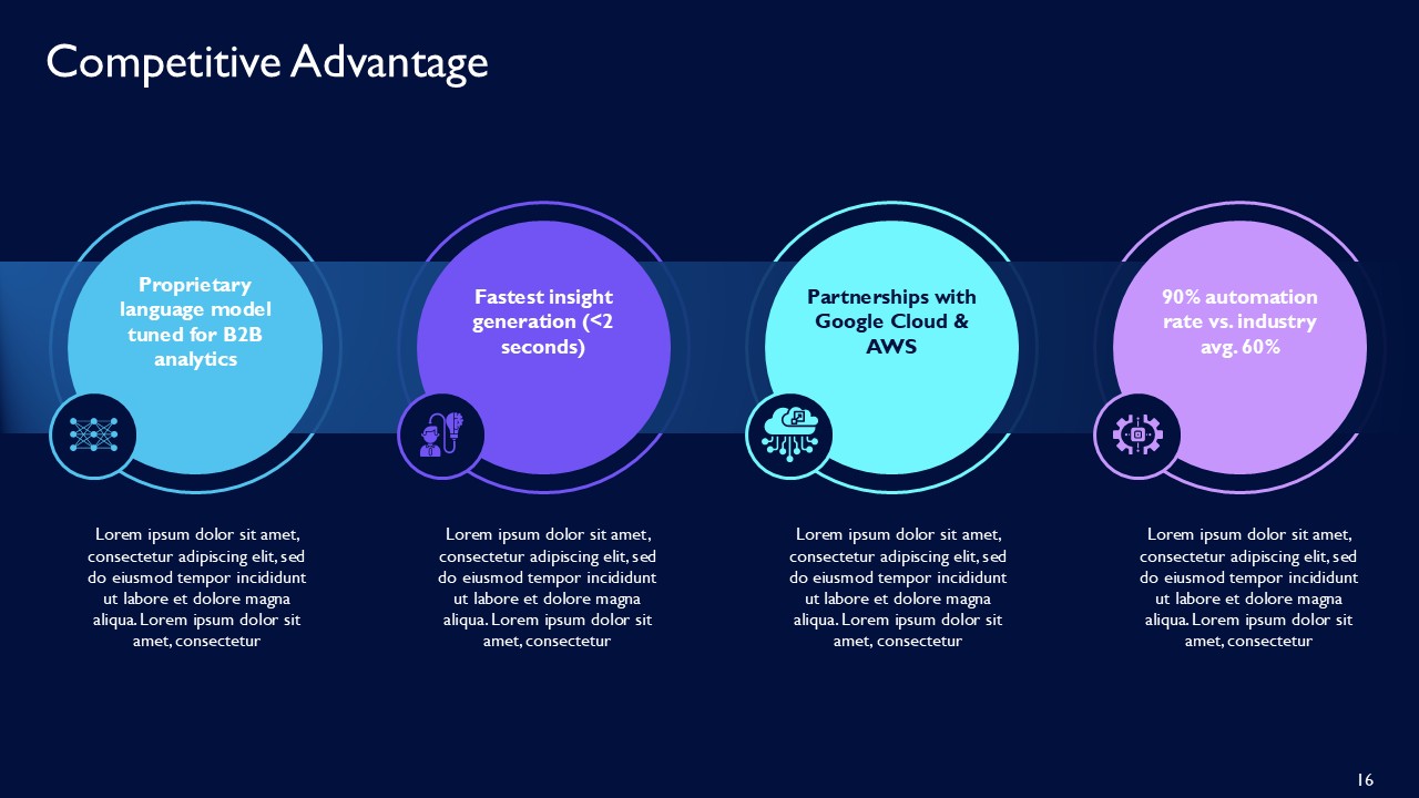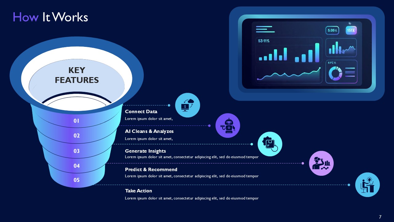 The IntelliCore AI SaaS Platform for Real-Time Business Insights PPT Template works with sleek real-time analytics model with advanced analytics frameworks and visual storytelling sophistications by providing a premium 21-slide template. It is structured with a geometric design filled with a balanced color palette of faith and innovative blue and purple that effortlessly demonstrates the transformational power of artificial intelligence on raw data to actionable dashboard business intelligence. IntelliCore AI SaaS Platform for Real-Time Business Insights PPT Template offers a premium minimalist design that also incorporates technical details to portray value to prospects investors, enterprise clients, and stakeholders.