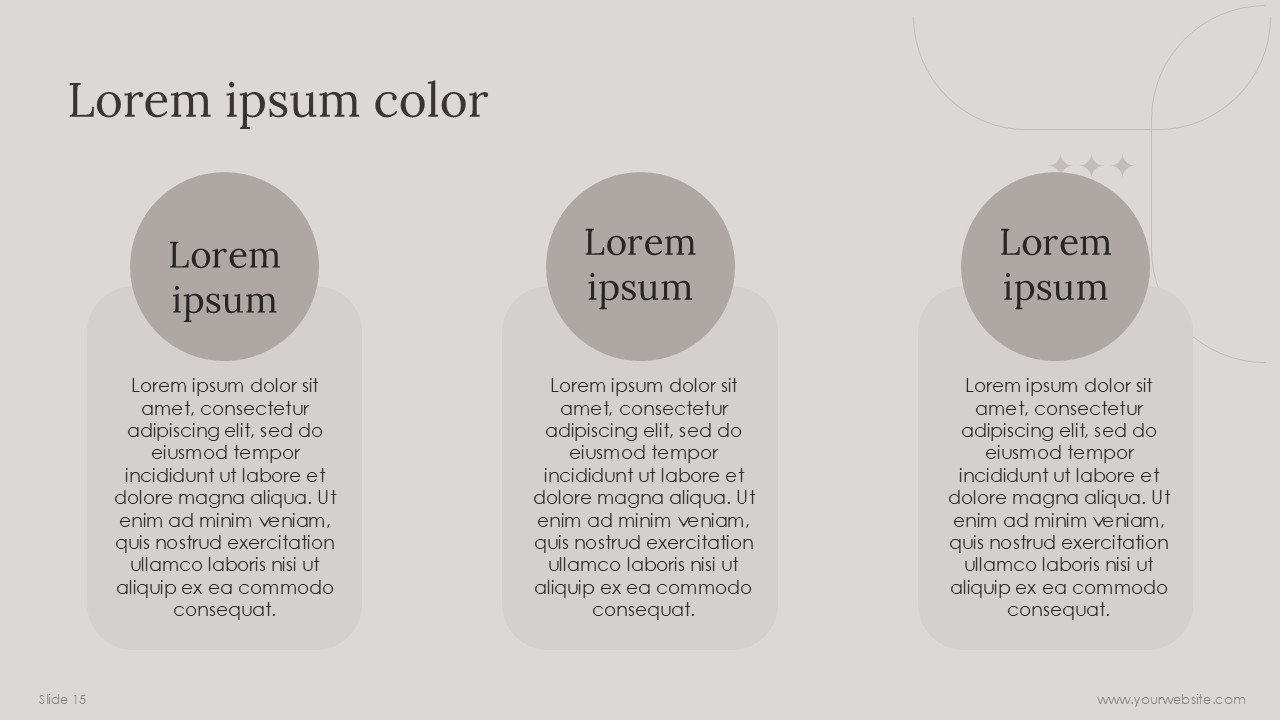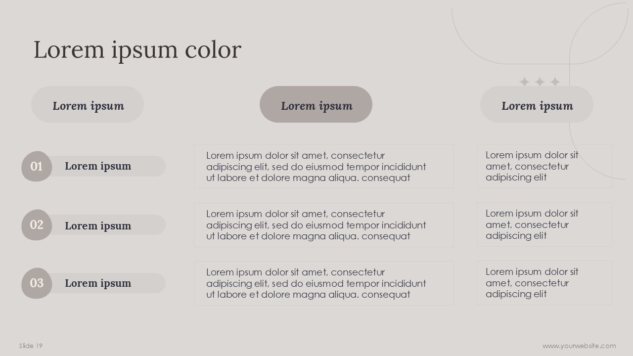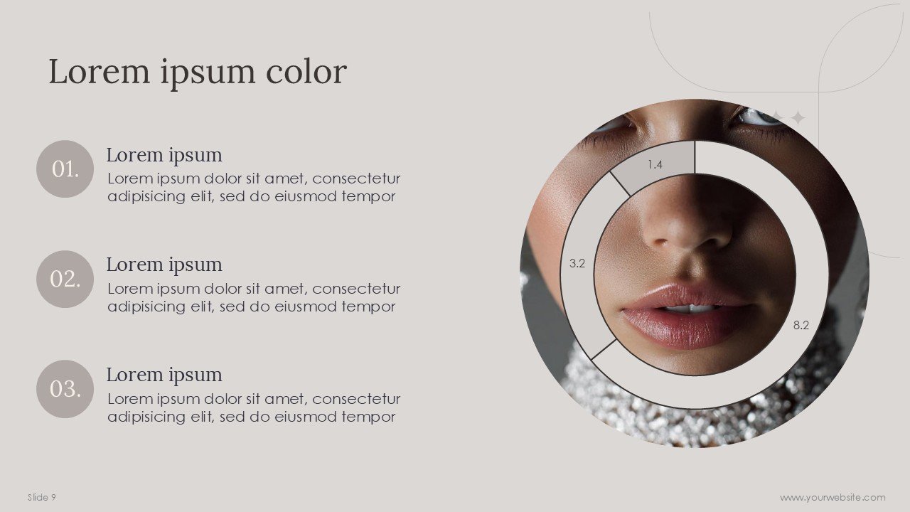 The PPT template is contemporary, so the design primarily consists of soft and neutral Cloud Dancer hues that draw the user’s eye. This template also allows the user a great number of customizations, so the user is free to change type, add or delete images, change the data presented in the graphs, and change or add icons, among other changes.