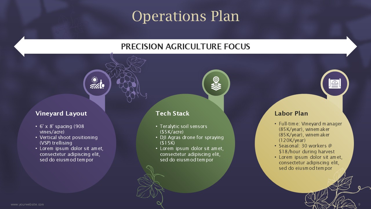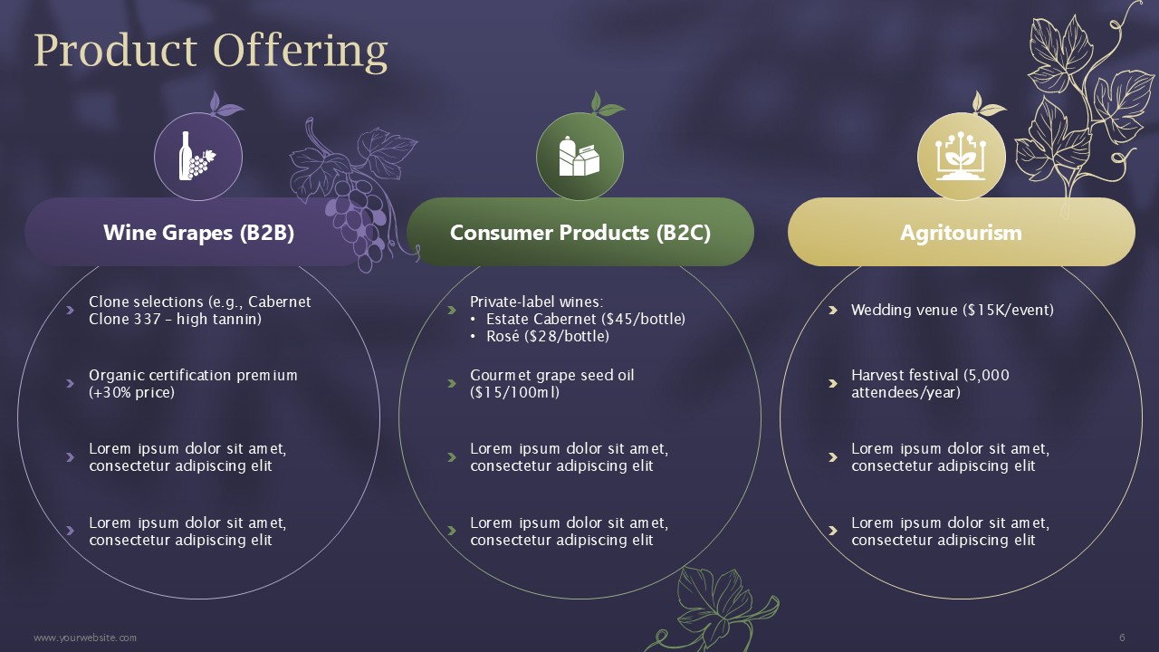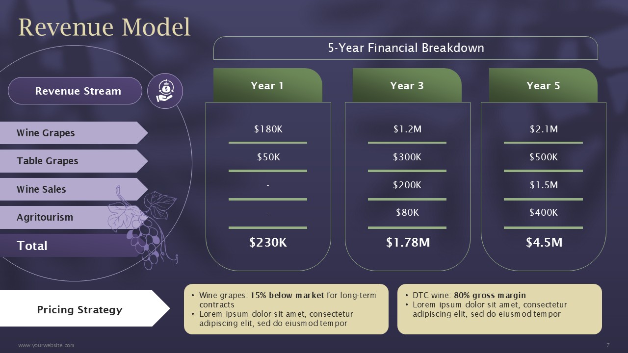 You can download the Modern Grape Vineyard Business Plan Presentation Template from our website and breathe life into your wine business with the perfect and balanced combination of strategy, narrative, and design. This template is perfect for anyone aiming to create a business which is based on old values, eco-friendly practices, and sustainable long vision growth.