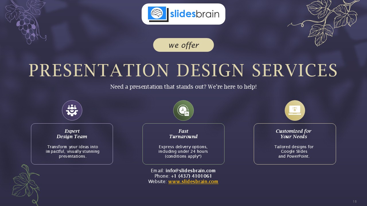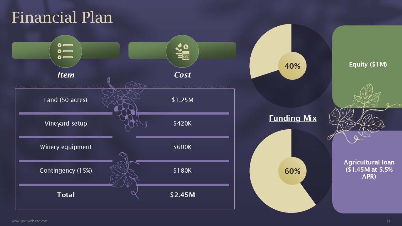 With a green, purple and cream color palette, the design possesses a natural and sophisticated touch. Green touches on the environmental and agricultural foundations of the business, purple relates to the culture of grapes and wine, and cream gives room for the information to breathe, lending to the elegant voice of the slides. The curated palette provides a visual narrative as sophisticated as the business.